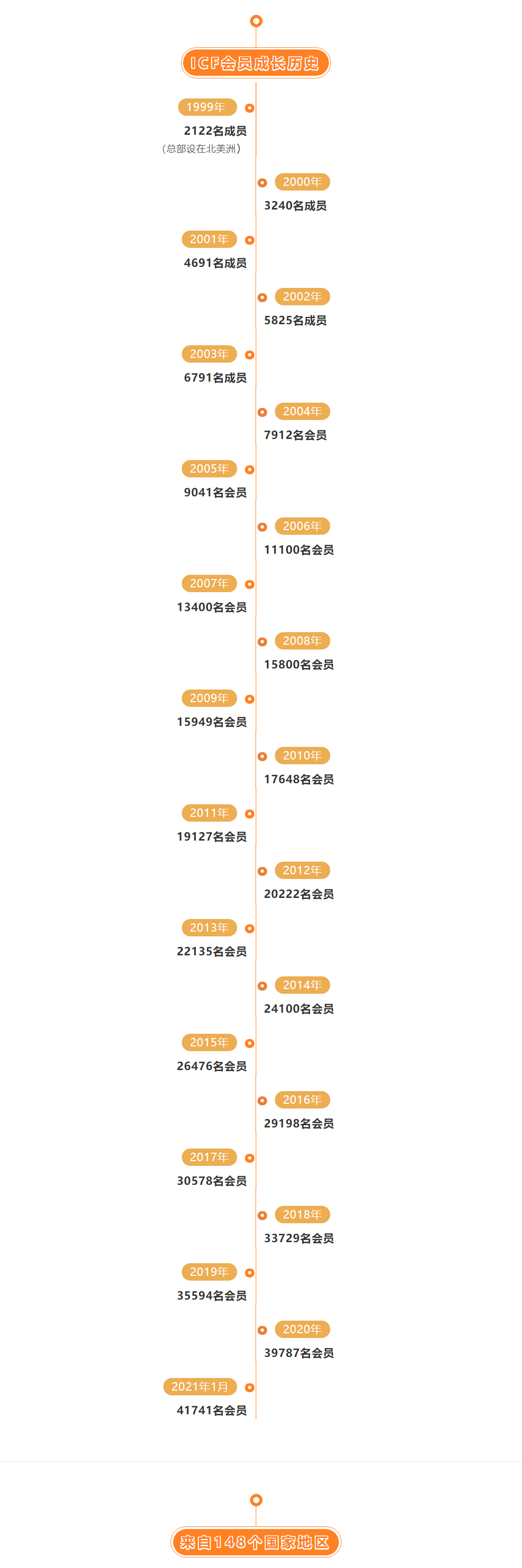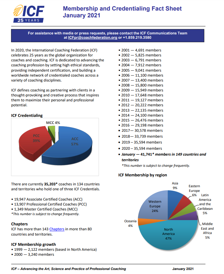 ICF一直致力于推进专业教练的艺术、科学和实践。ICF将“教练”定义为与客户在一个发人深省和创造性的过程中合作,激励他们最大限度地发挥个人和职业潜能。 (以下数据都是截止到发稿日的统计,数量会随着日期的变化而发生变化。)