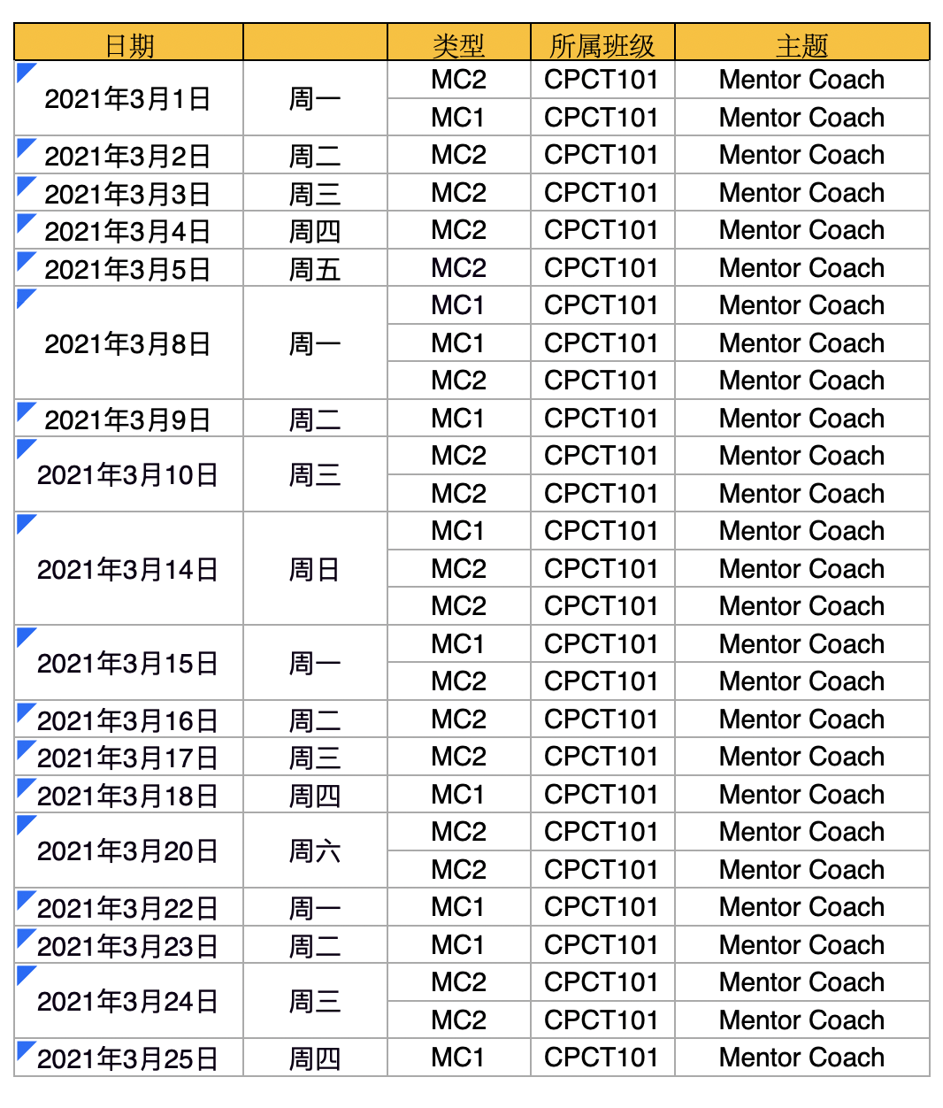 2021年3月MC1、MC2课程时间安排表(CPCT101)