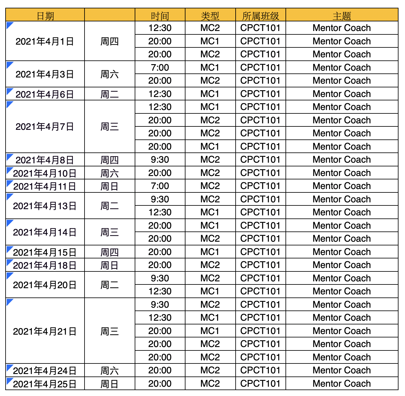 2021年4月MC1、MC2课程时间安排表(CPCT101)