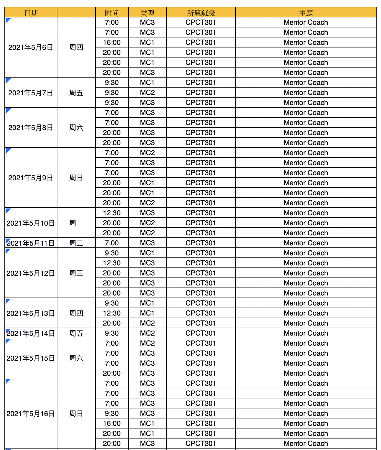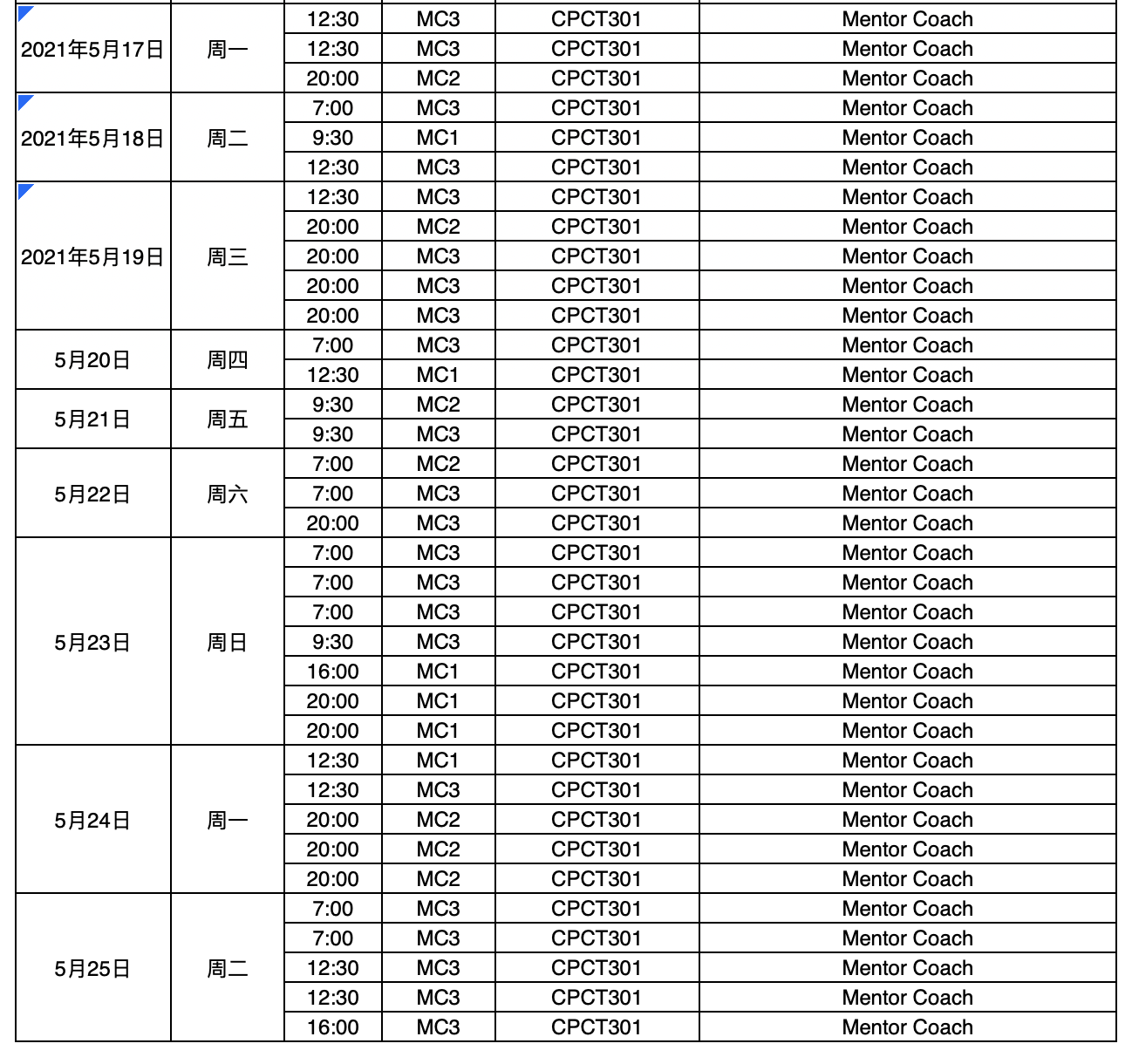 2021年5月MC3及MC(加场)课程时间安排表(CPCT301)