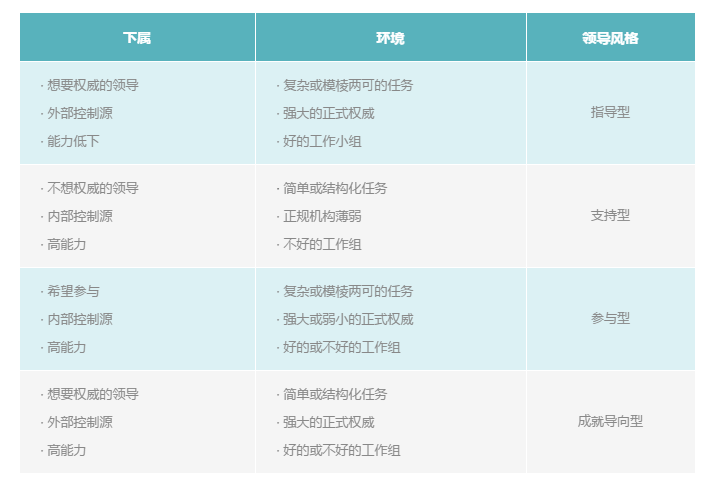 从表中可以看到,你可以将下属和环境因素的需求进行匹配,以确定要使用的最佳领导风格。(如果下属和环境组合介于这四个组之间,请使用适当的样式组合)