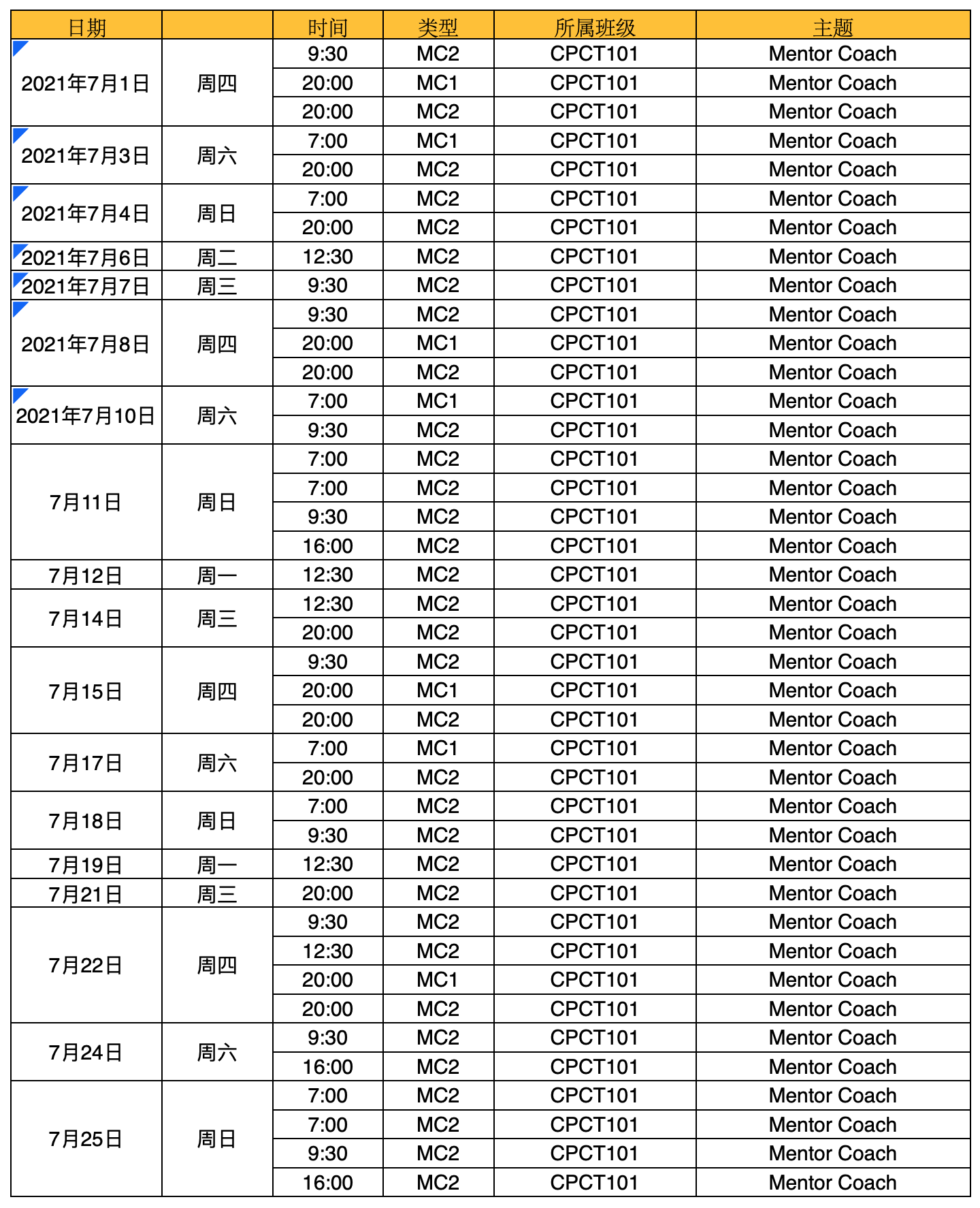 2021年7月MC1、MC2课程时间安排表(CPCT101)