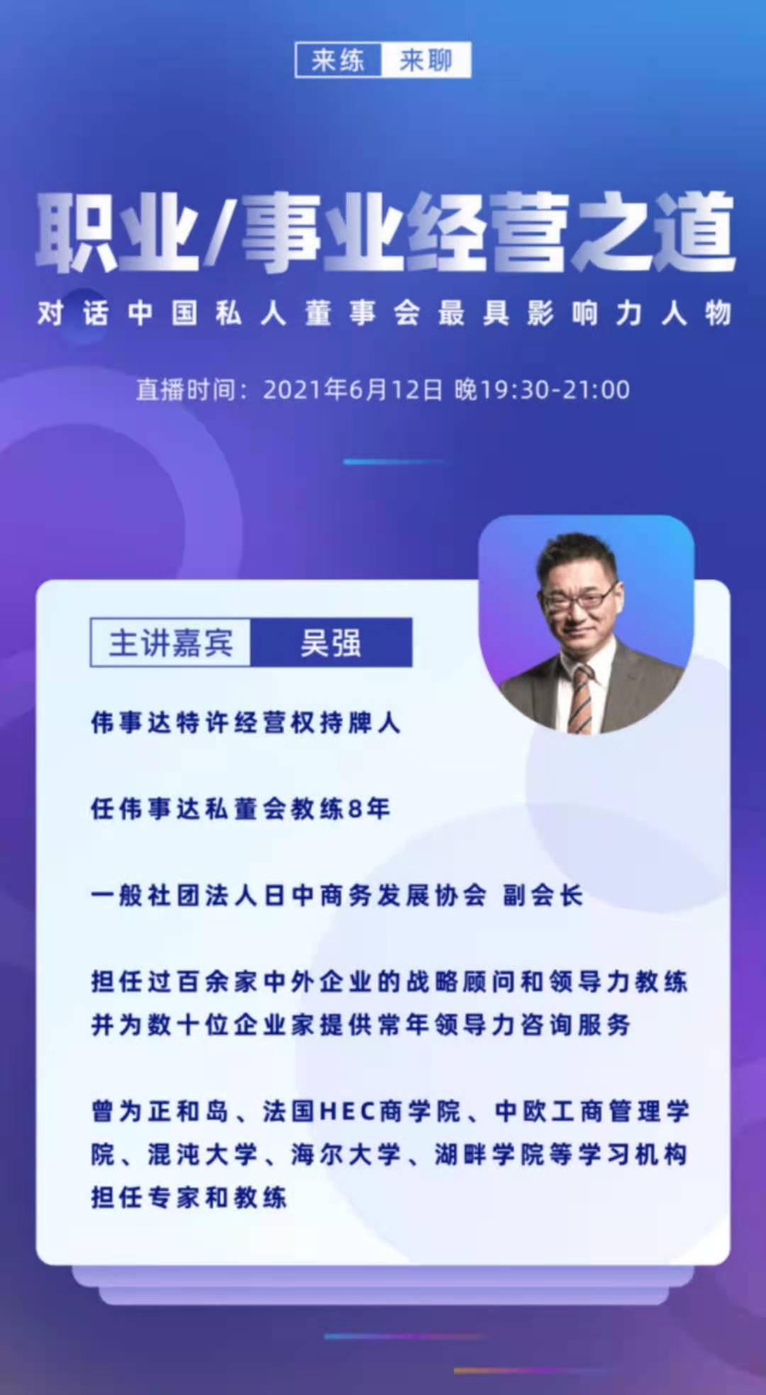 6月12日晚上,来练私董会邀请了一位重量级嘉宾——吴强来传授事业经营之道。实力太强,直接上图。