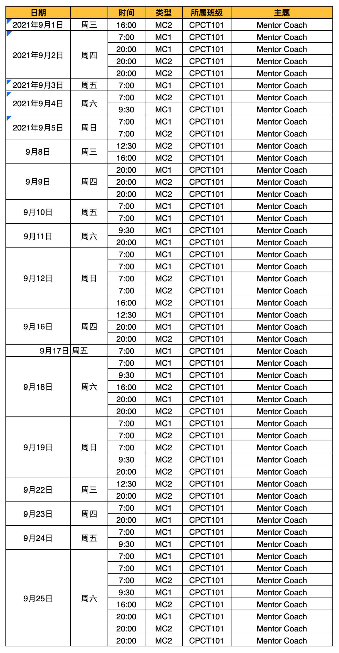2021年9月MC1、MC2课程时间安排表(CPCT101)