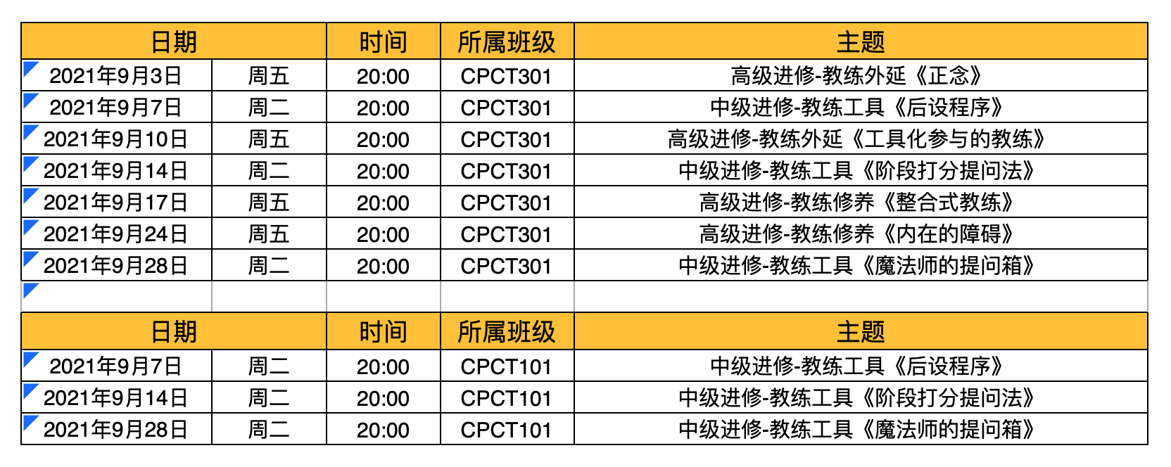 2021年9月主题课程时间安排表