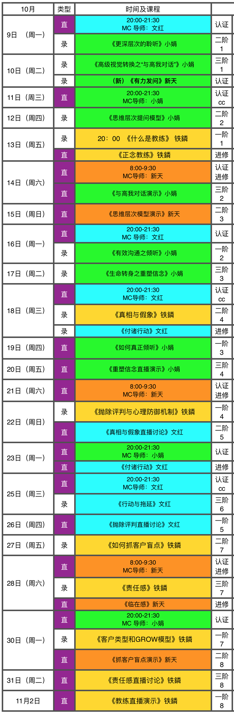 2017年10月课程时间安排表