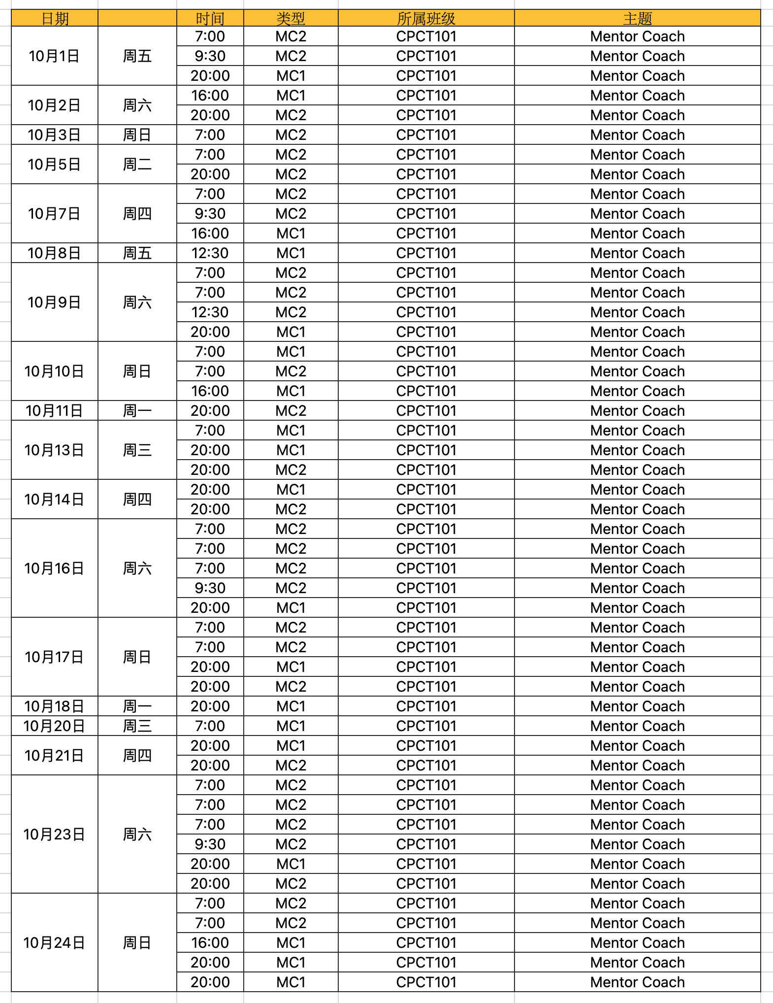 2021年10月MC1、MC2课程时间安排表(CPCT101)