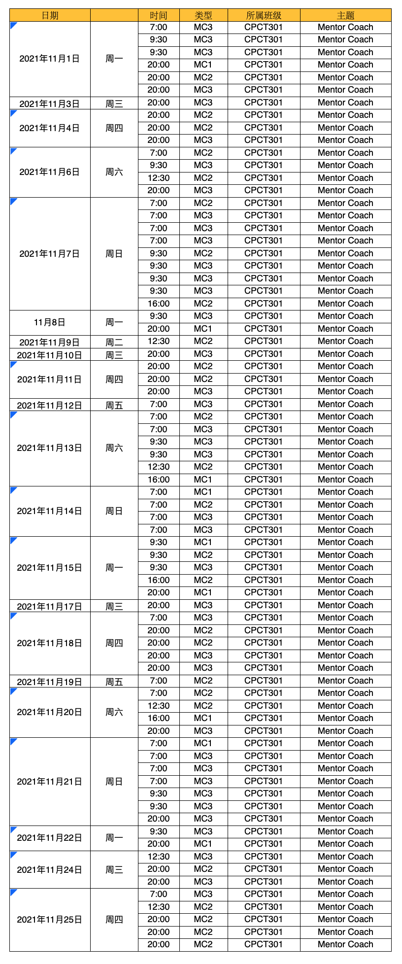 2021年11月MC3及MC(加场)课程时间安排表(CPCT301)