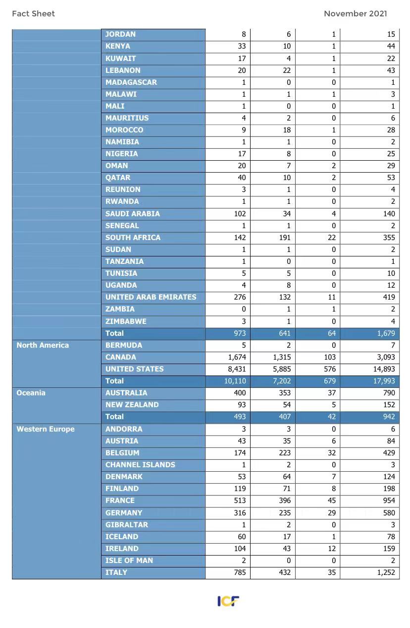 ICF在151个国家和地区拥有46615个会员(较10月增长1773人),在80多个国家拥有超过143个分会(ICF分会是用来发展ICF成员及线下活动的公益性组织)。