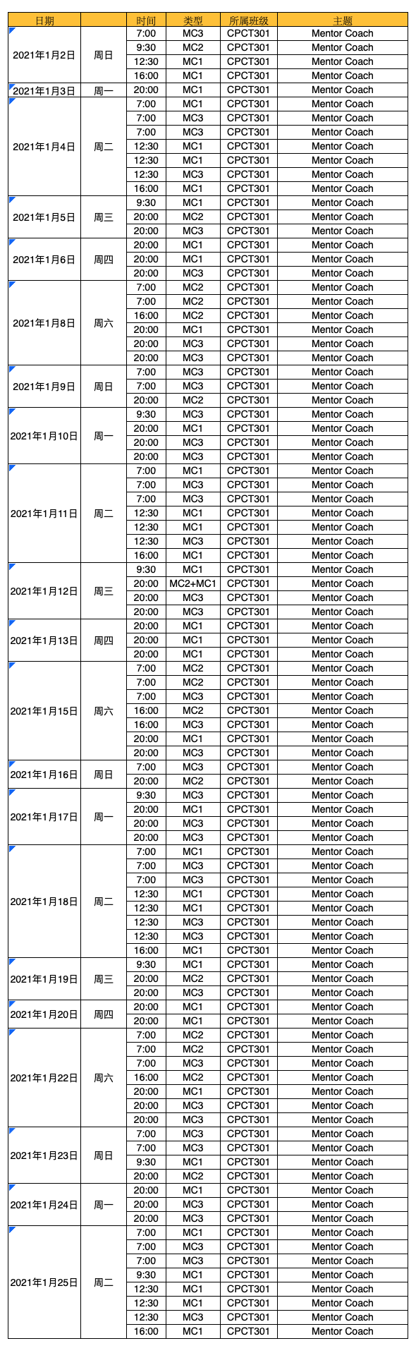 2022年1月MC3及MC(加场)课程时间安排表(CPCT301)