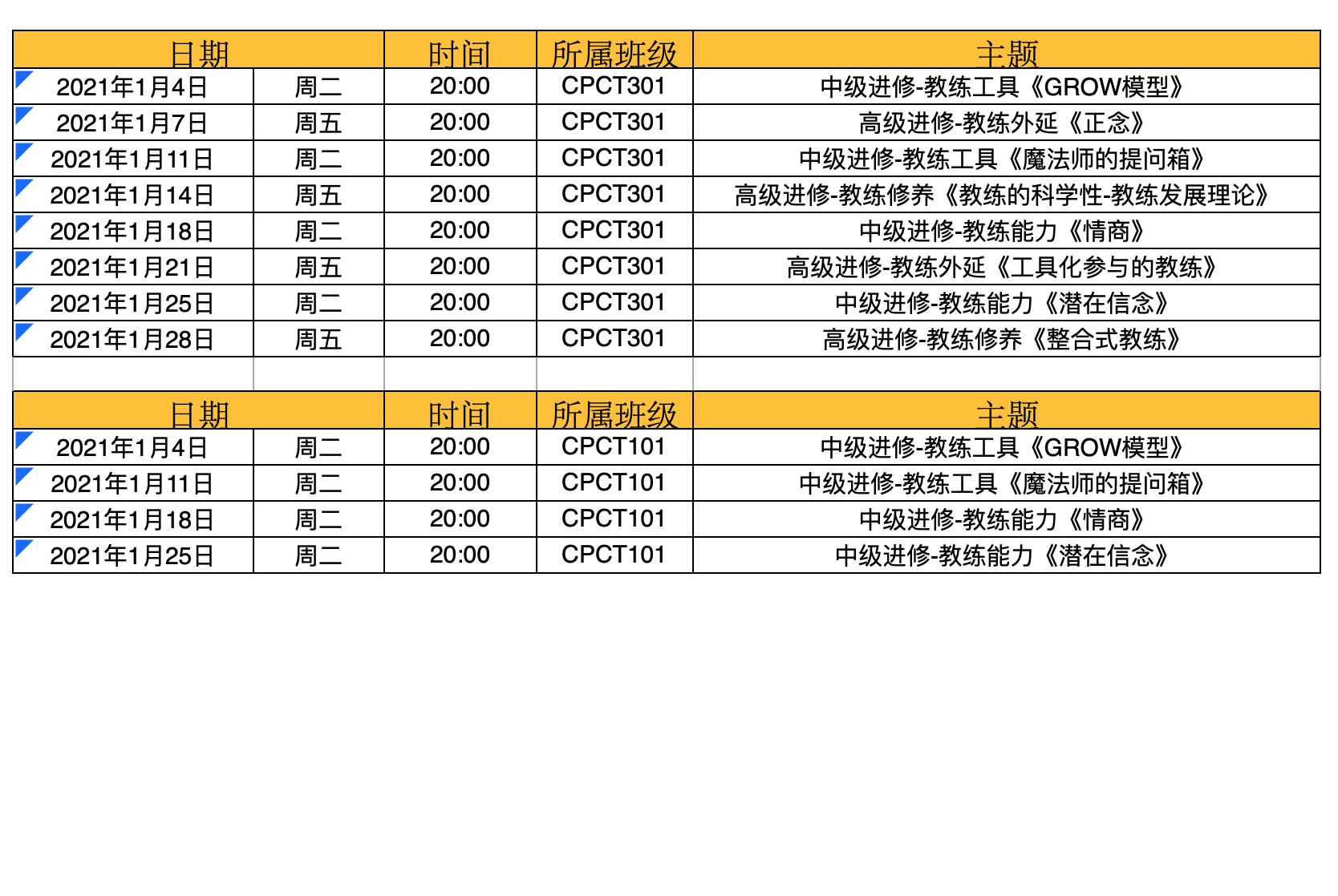 2022年1月主题课程时间安排表