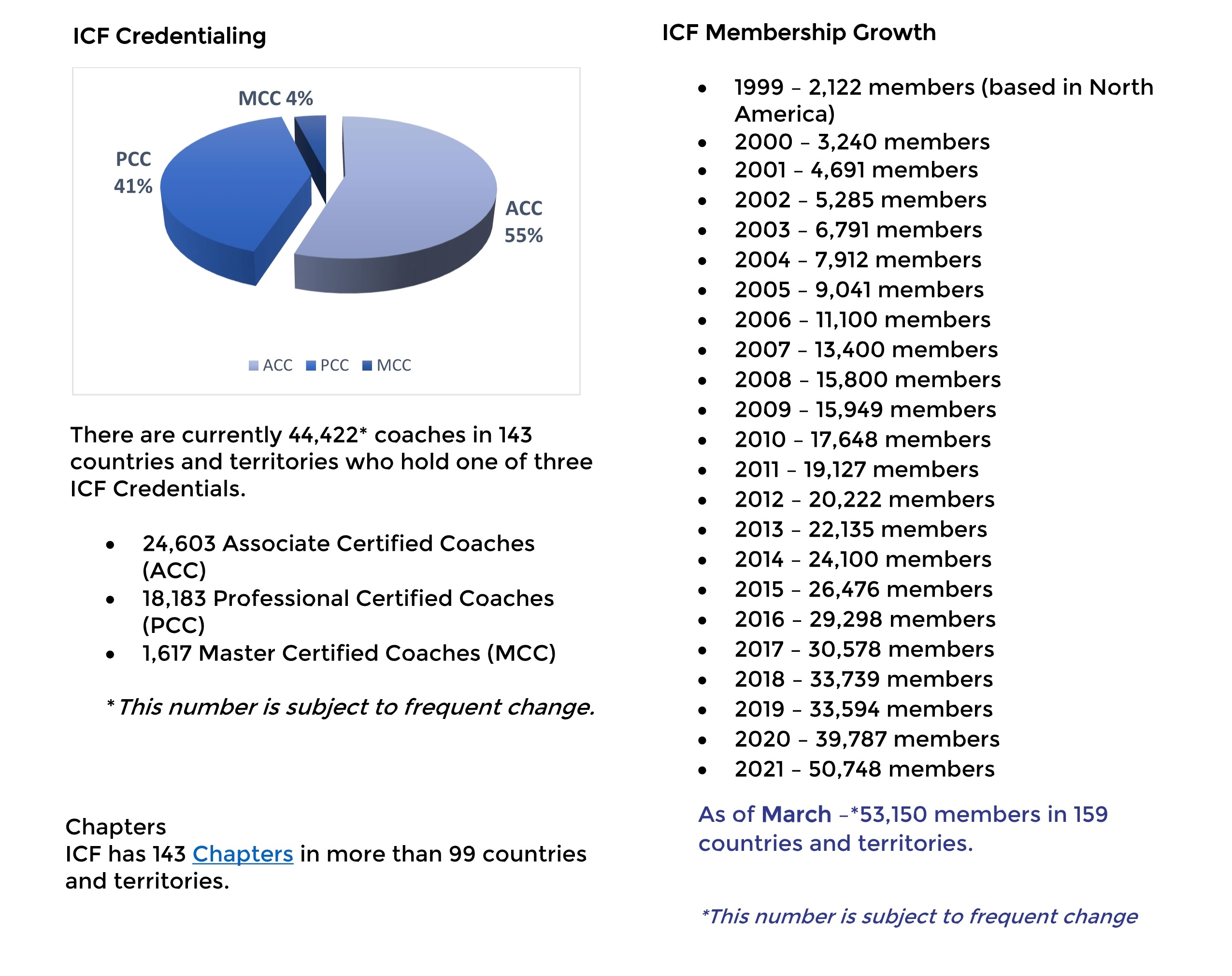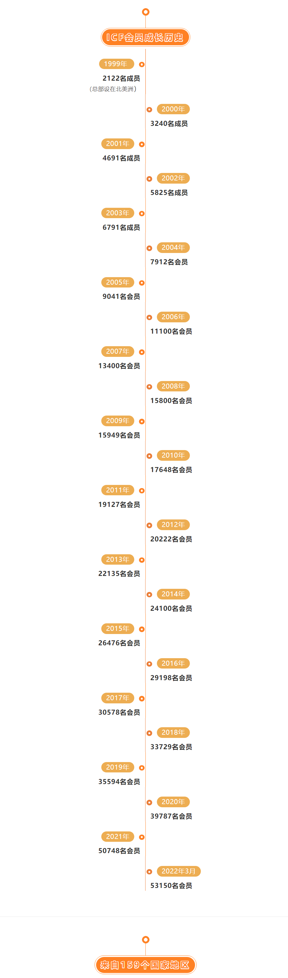 ICF在159个国家和地区拥有53150个会员(较上月增长1213人),在80多个国家拥有超过143个分会(ICF分会是用来发展ICF成员及线下活动的公益性组织)。