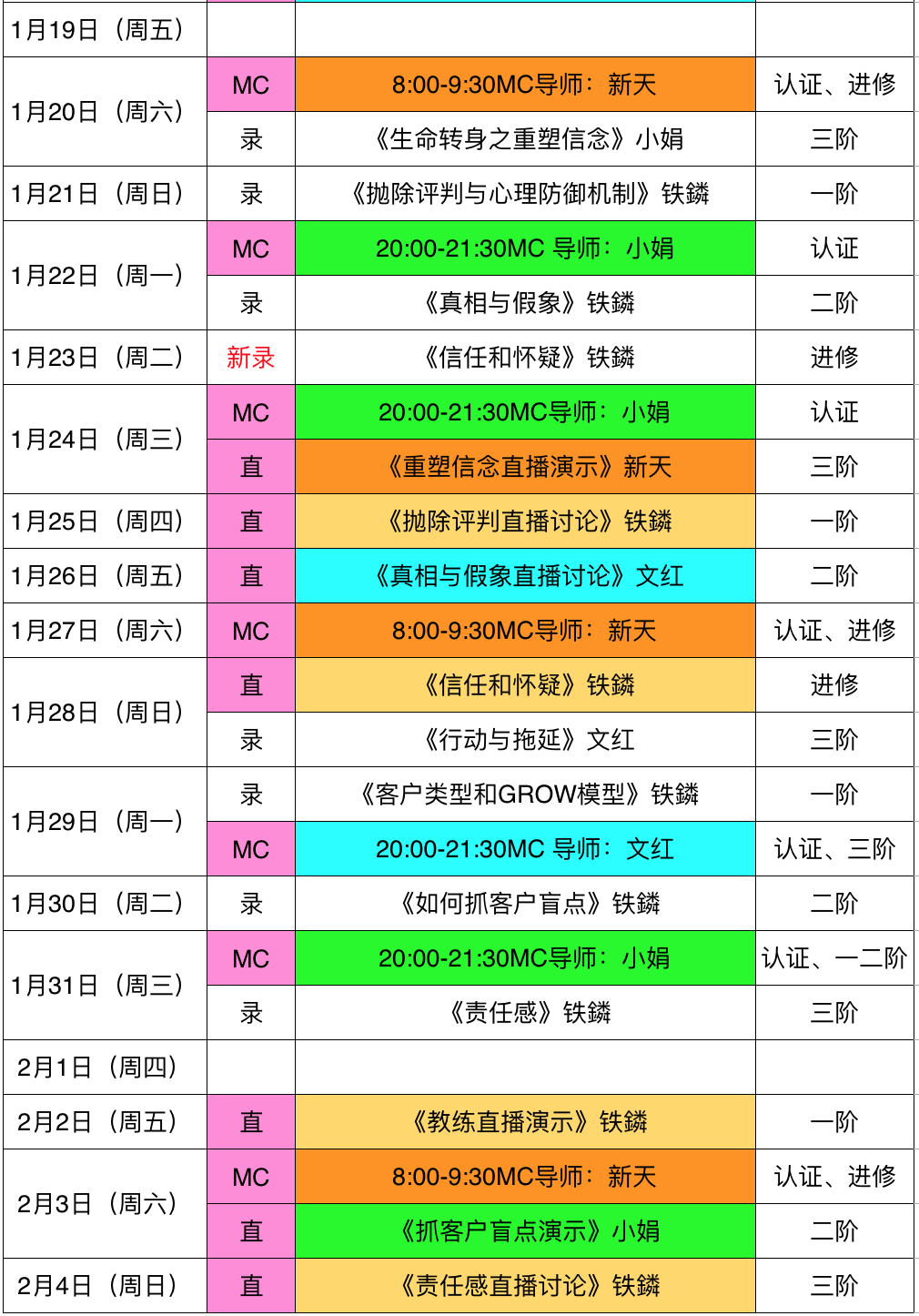 2018年1月课程时间安排表