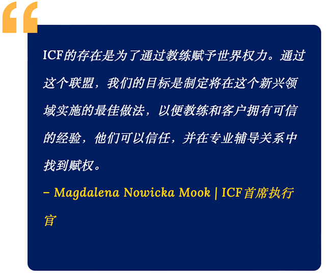 通过这些创新,教练、客户和组织应该能够信任教练平台的运作方式,并对其提供的产品有信心。为了确保这一点,ICF一直在与领先的全球教练平台提供商结成联盟,以制定运营标准和道德规范,既可以指导教练和客户,同时在选择教练合作伙伴时做出选择。