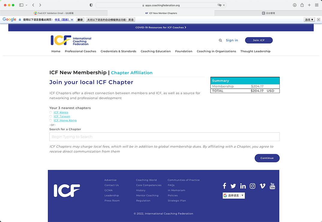 下面是关于ICF的分会信息,由于中国现阶段并没有ICF的分会,所以你可以选择HongKong或者直接不选