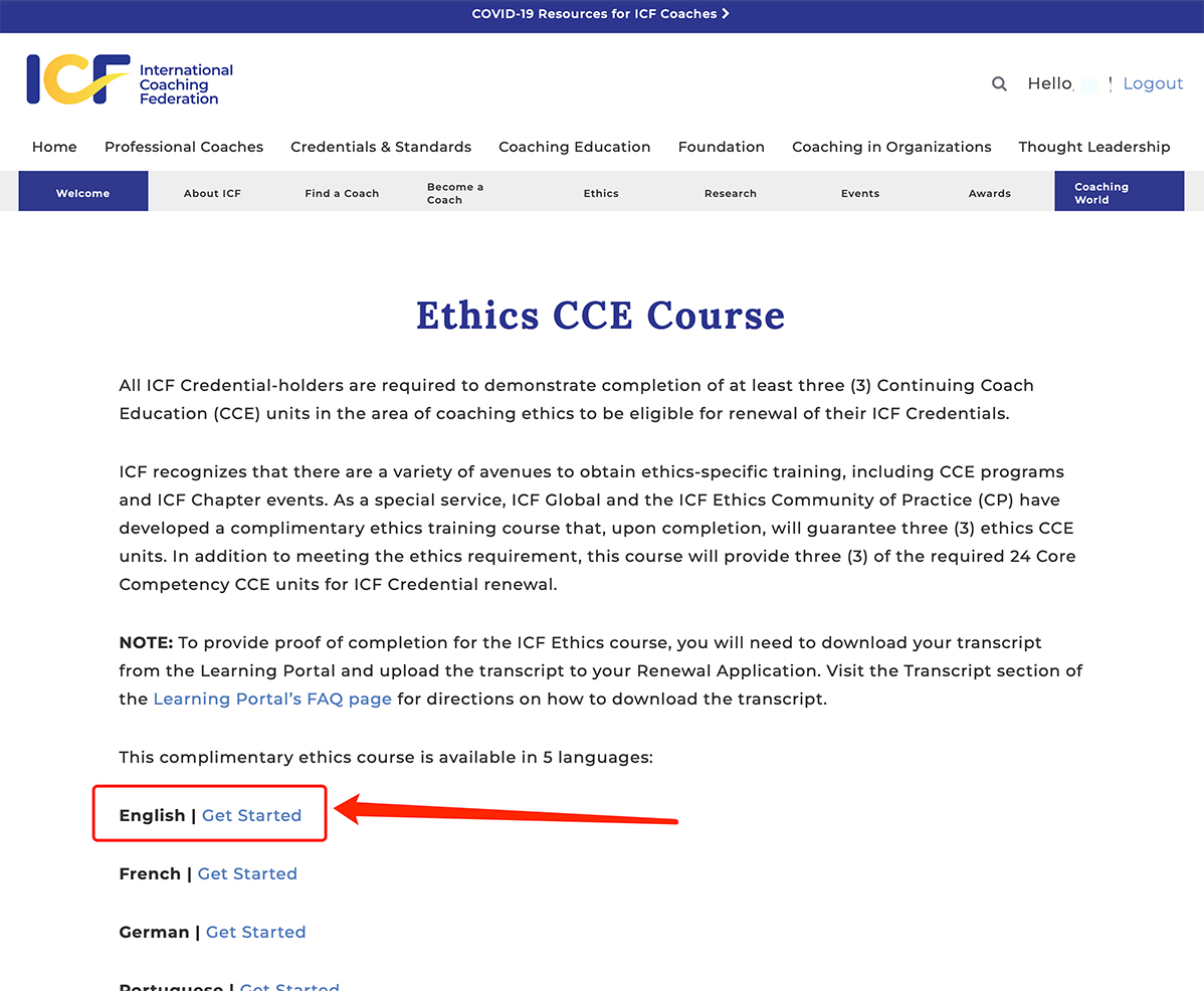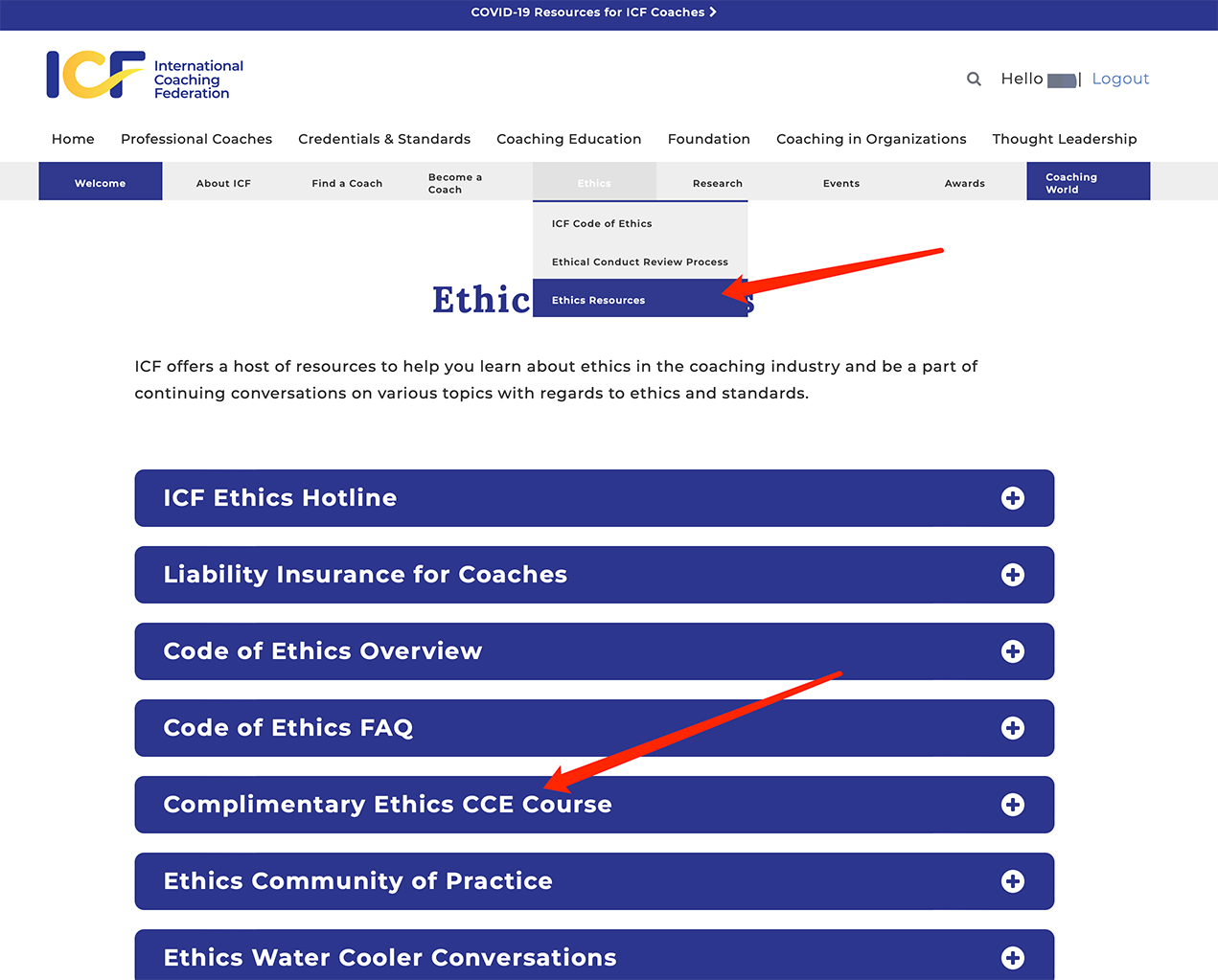 首先进入ICF的网站,然后点击顶部选项卡的Ethics 字样,底下的 Ethics Resources 字样,然后可以看到下面的图片,然后点击红色箭头的Coplimentany Ethics CCE Course 选项卡