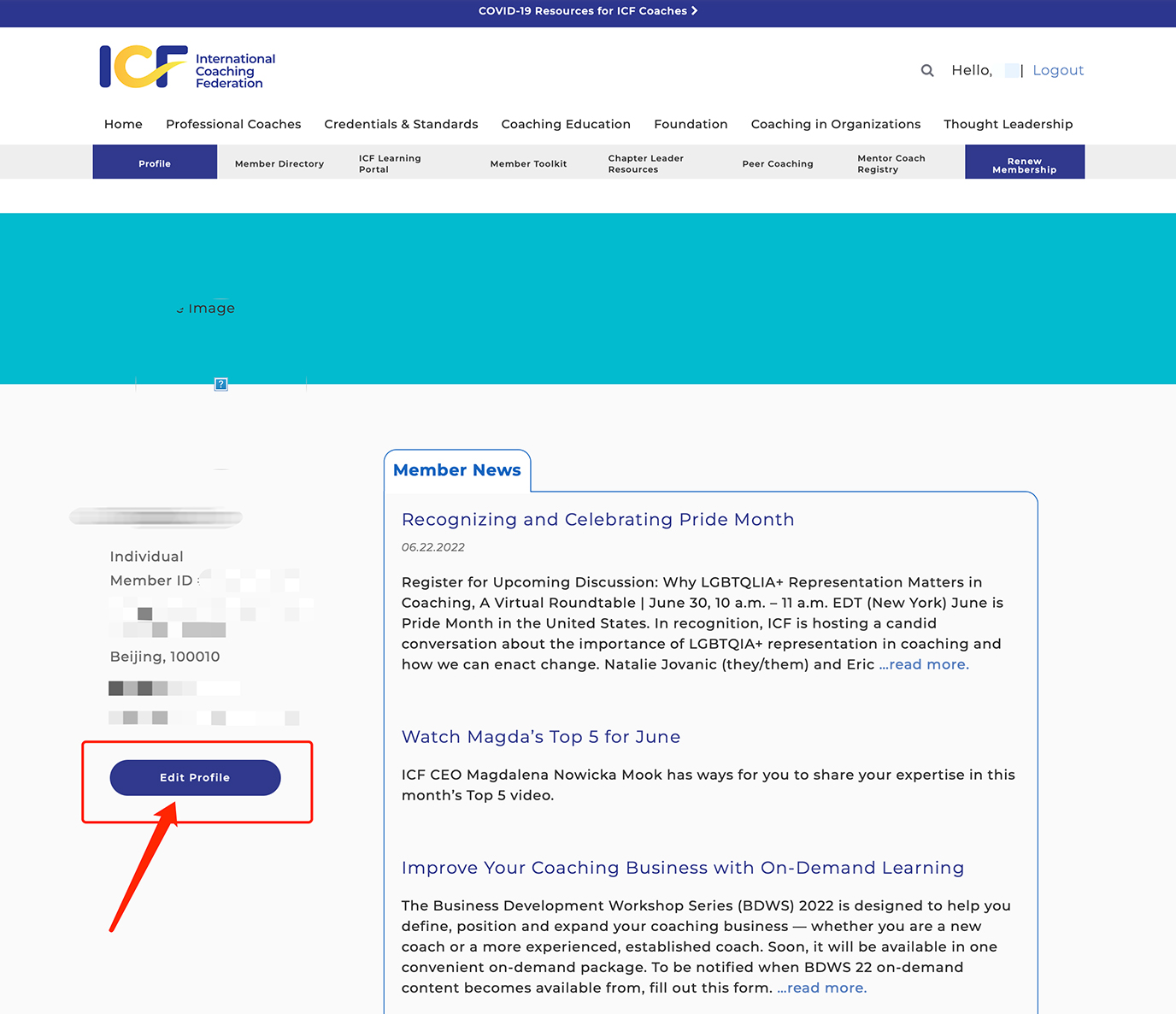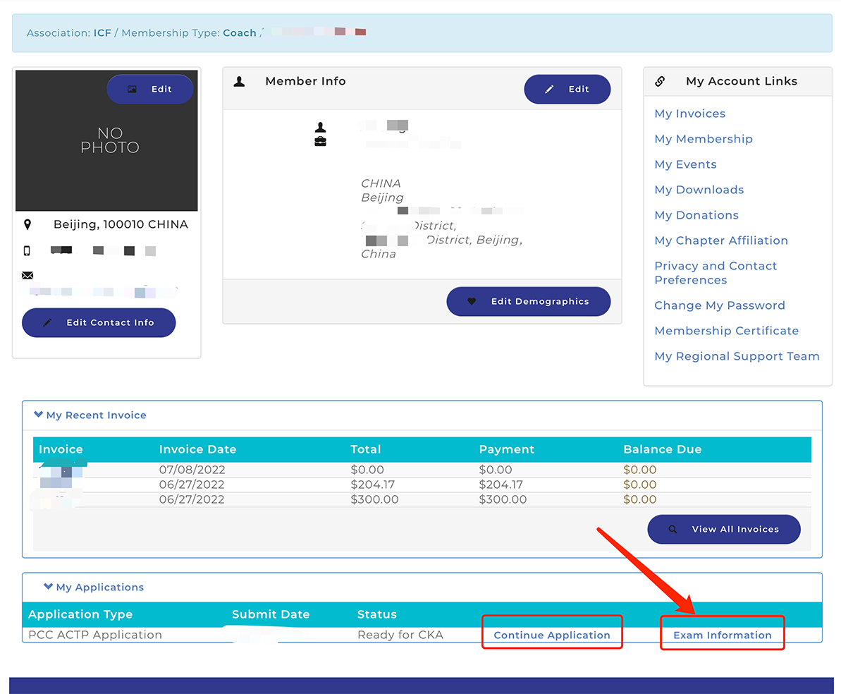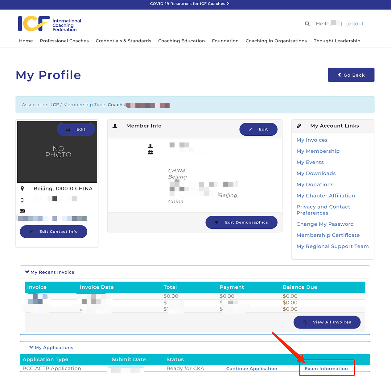 2021年,ICF(国际教练联盟)对旗下认证教练模块的CKA考试进行了升级。CKA考试的全称是 ICF Coach Knowledge Assessment Exam (CKA) ICF教练知识评估考试(CKA)。很多人对这个流程如何做不是很清楚,所以今天我们来给大家讲一下这个流程和网站的界面。首先关于如何申请ACC、PCC请查看我们以往的文章 (/site/article_detail/id/1538) 。然后用会员身份登录,点击下图右下角红色框和红色箭头的地方。