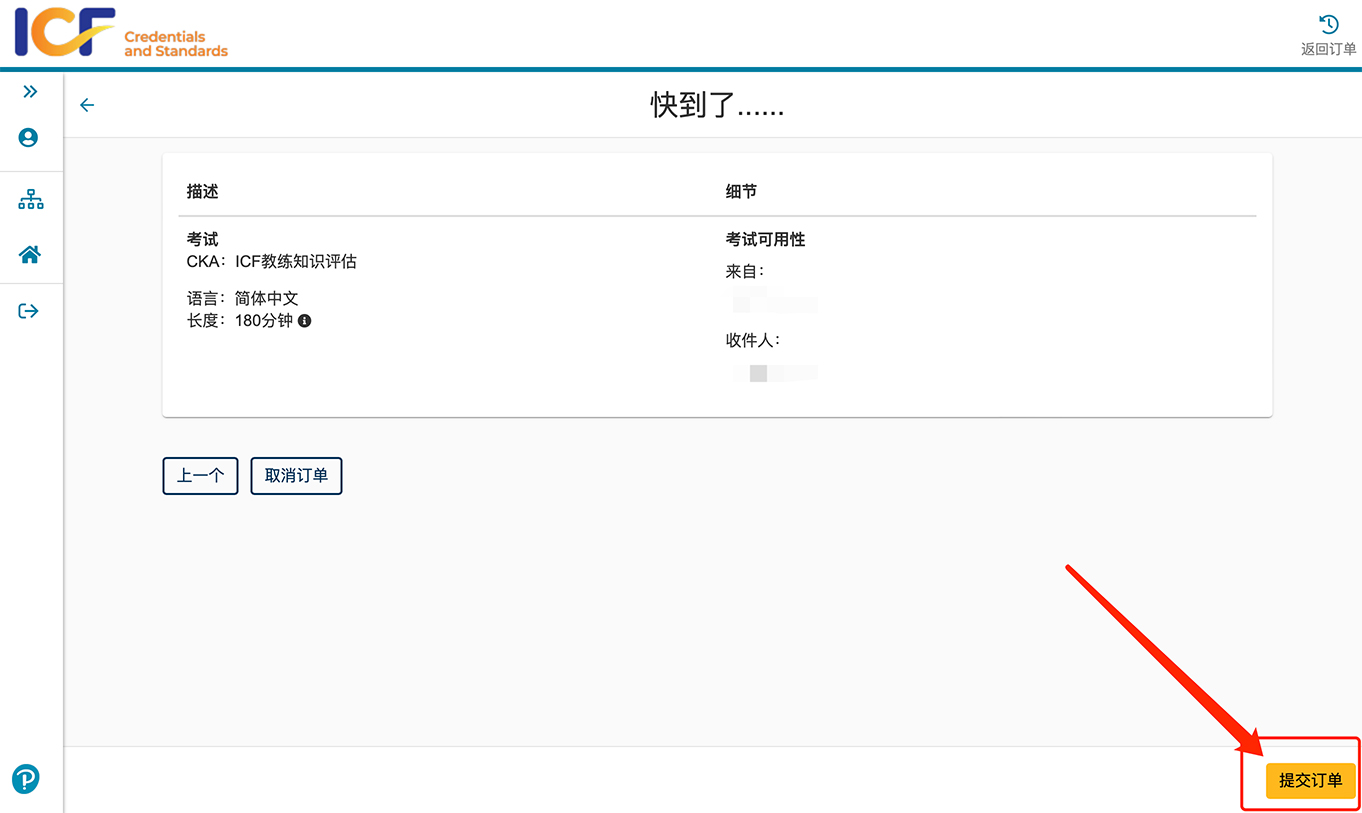 点击进入以后,可以看到如箭头所示的文字,这些都是对考试的基本介绍,请点击左边红框的 CKA:ICF Coach Knowledge Assessment 字样。