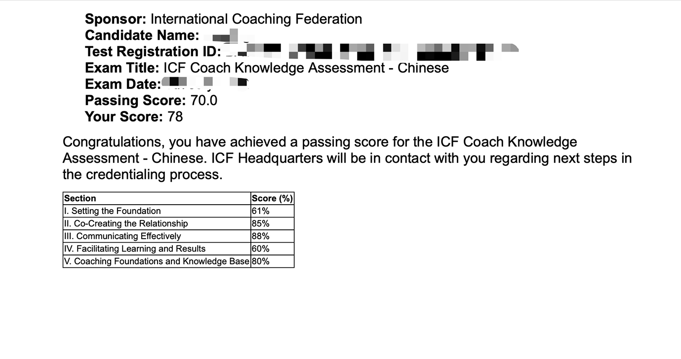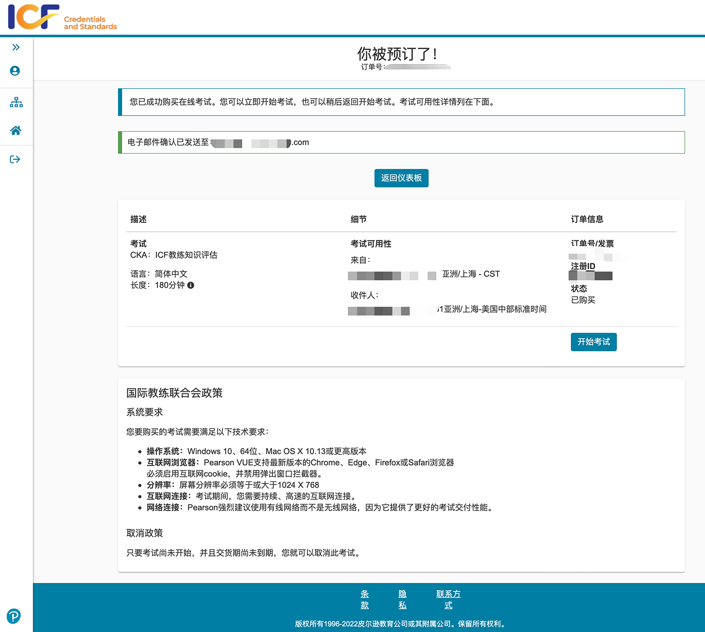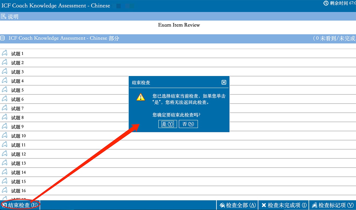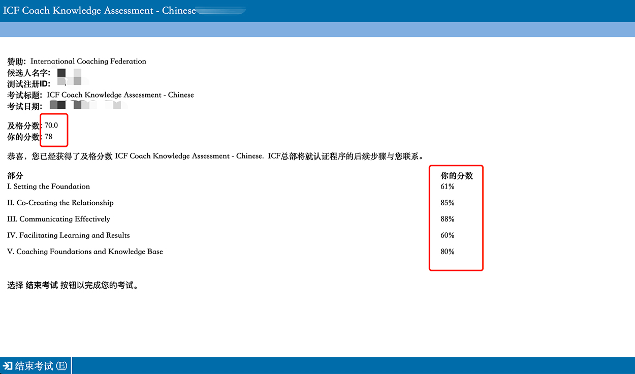 弹出窗口点击 是 结束考试。结束后会出现考试成绩考试就结束了,接下来就是等待ICF确认的邮件了。