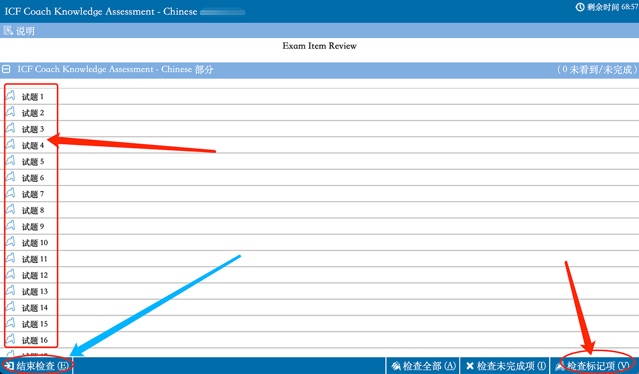 点击右下角的红色框可以进入所有题目的总览,所以考试的时候如果不确定可以点击右上角的标记按钮。如果没有什么要进行修改的,就点击左下角的 结束检查 按钮。