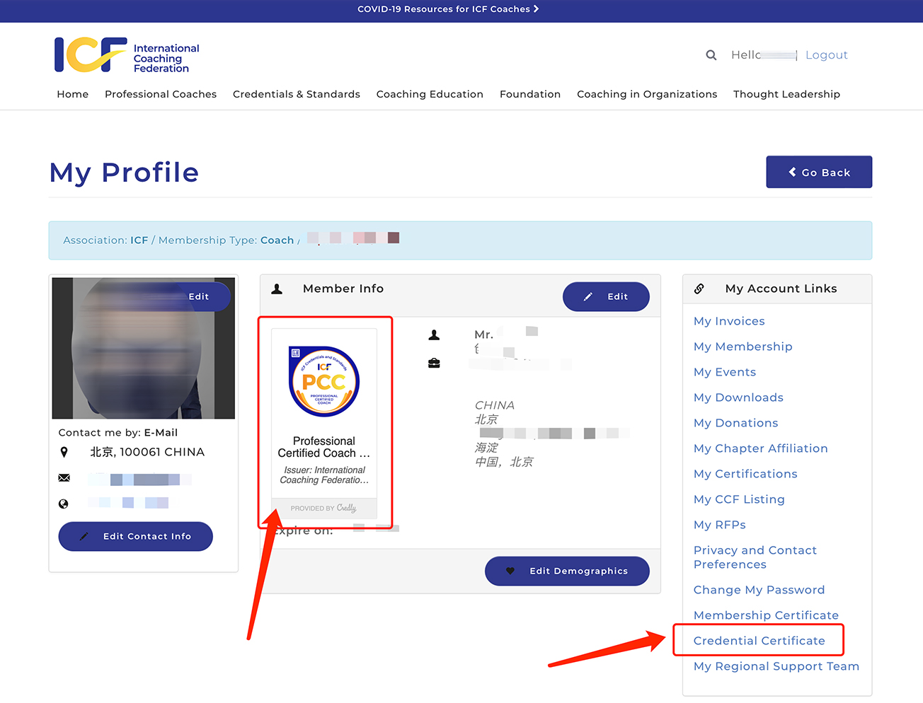 如果证书已经审批通过,再次登录ICF网站就可以按到自己的证书标志,可以点击下图红框的地方查看自己的证书和徽标。