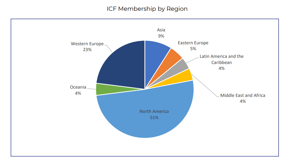 ICF在161个国家和地区拥有46619个会员,在99多个国家拥有超过140个分会(ICF分会是用来发展ICF成员及线下活动的公益性组织)。