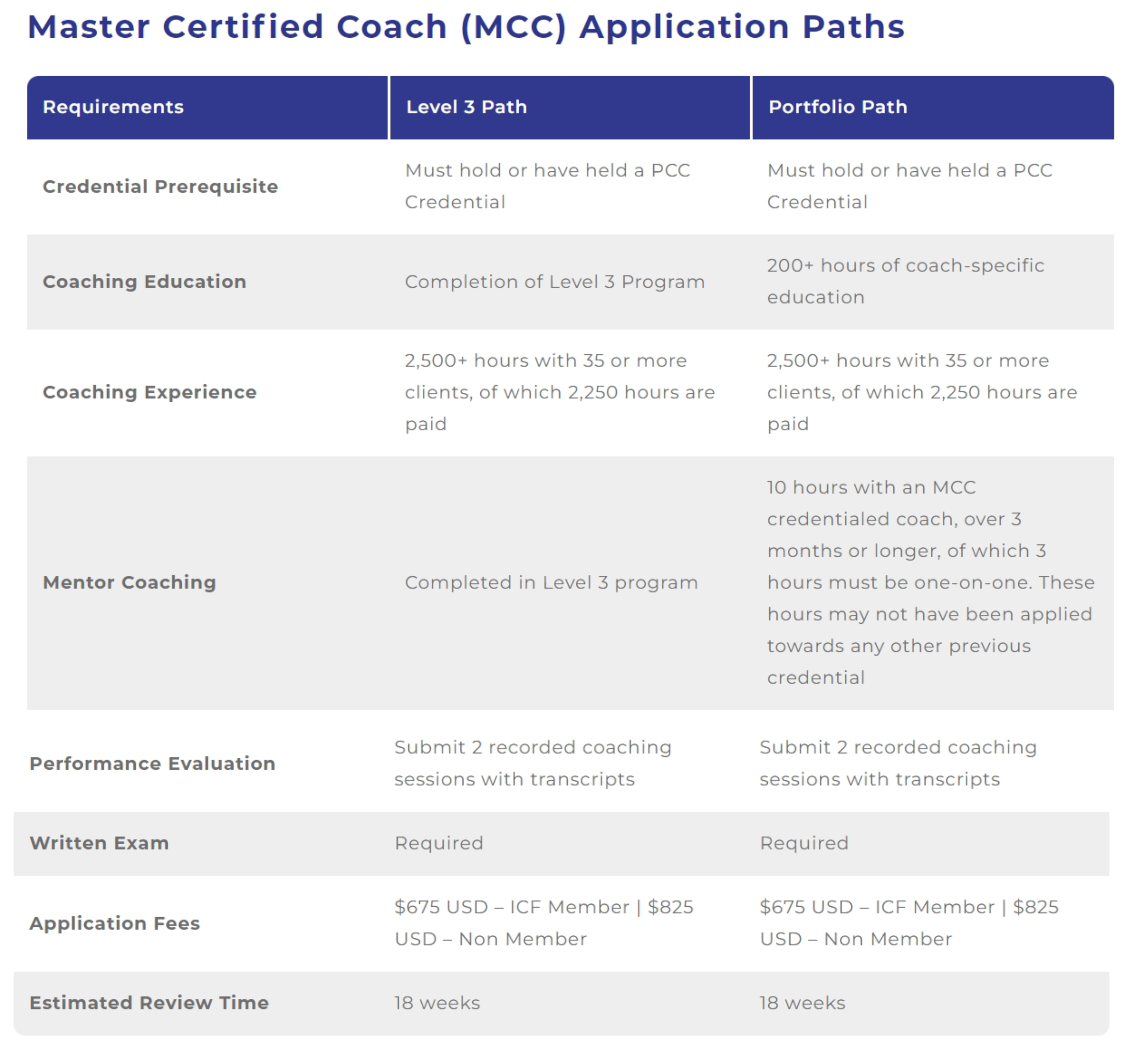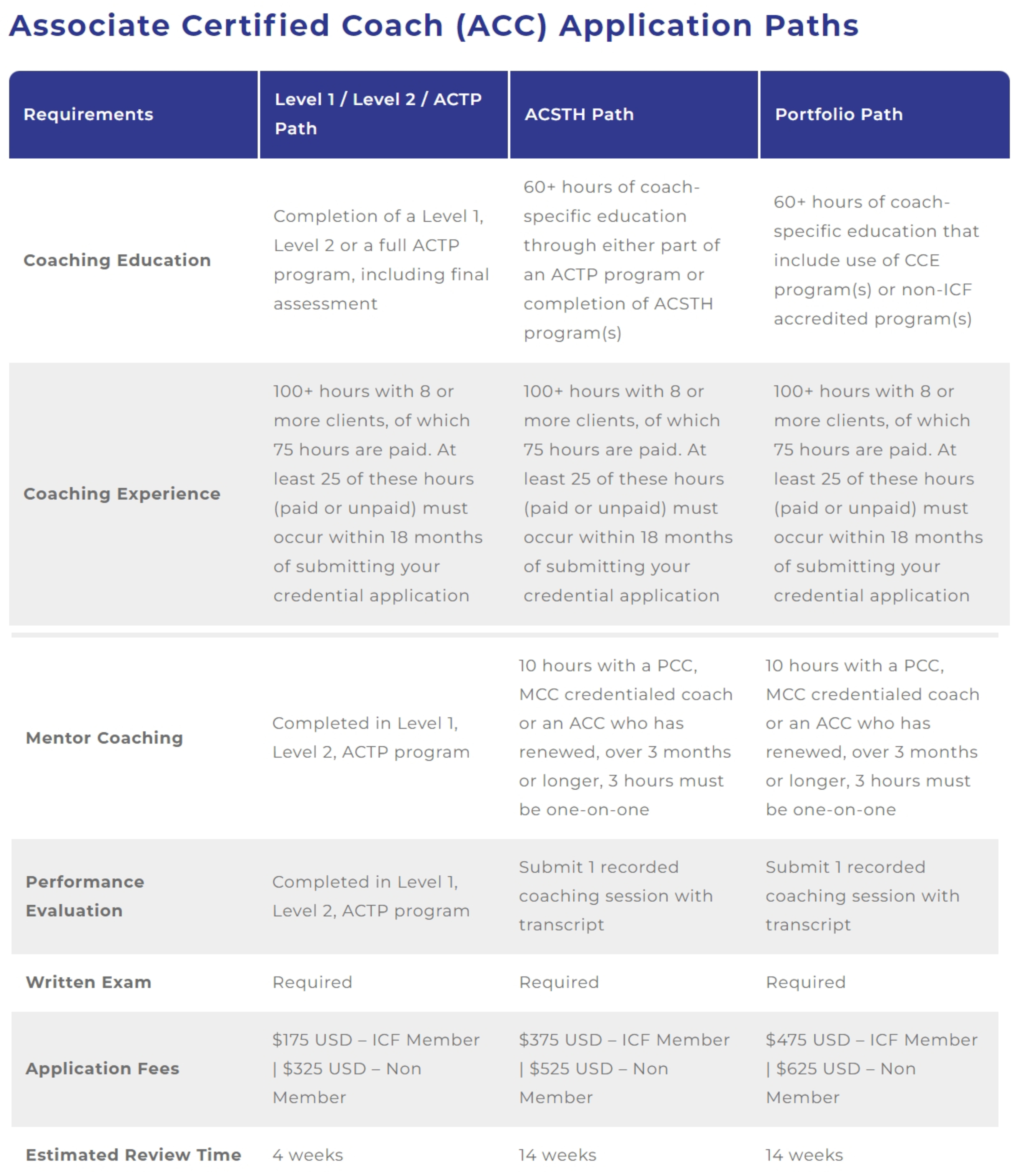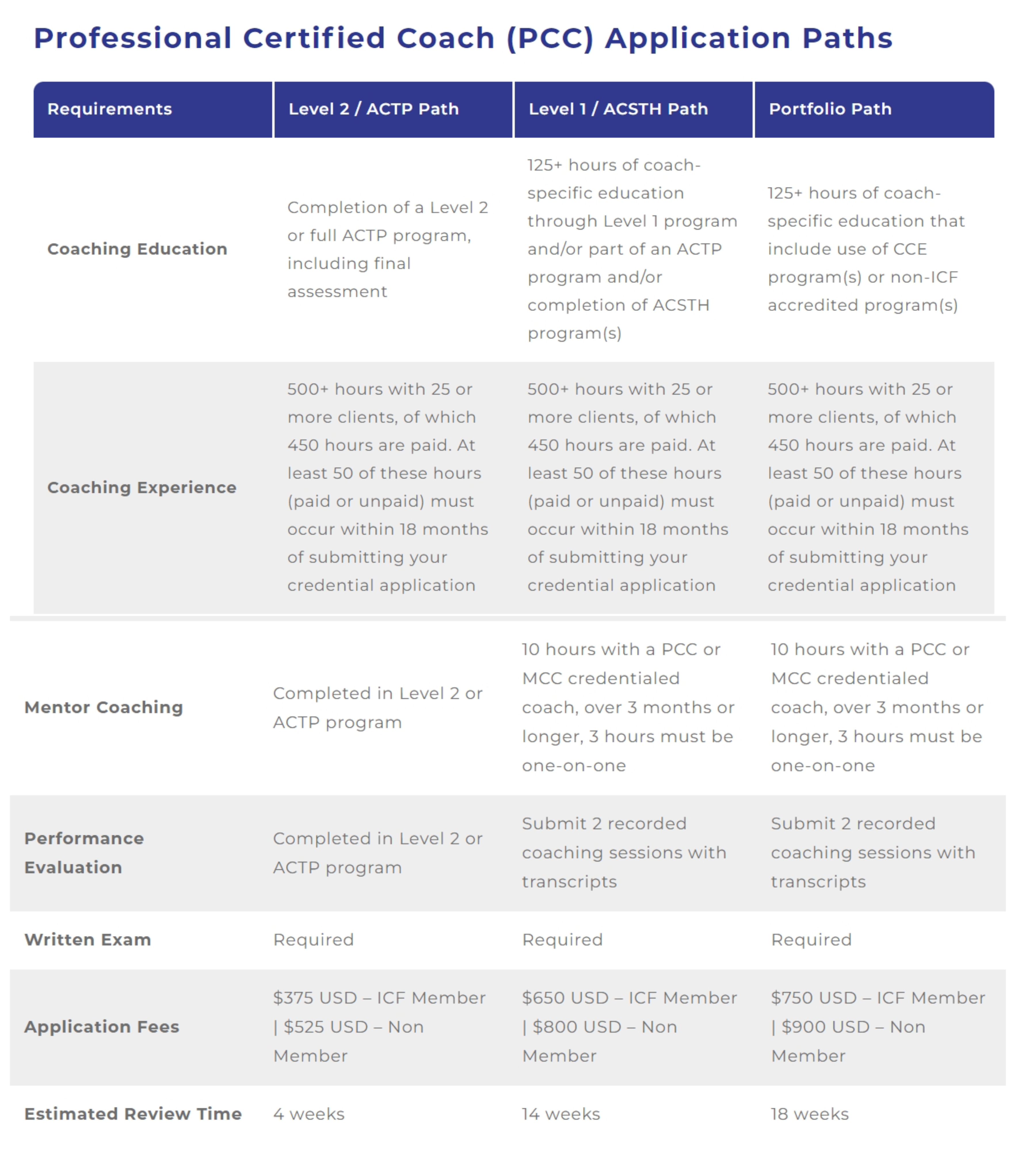 对于每个ICF证书(ACC、PCC和MCC),ICF都提供了多种途径来申请和获得证书。所有路径都包含相同的要求,并指向相同的凭据。