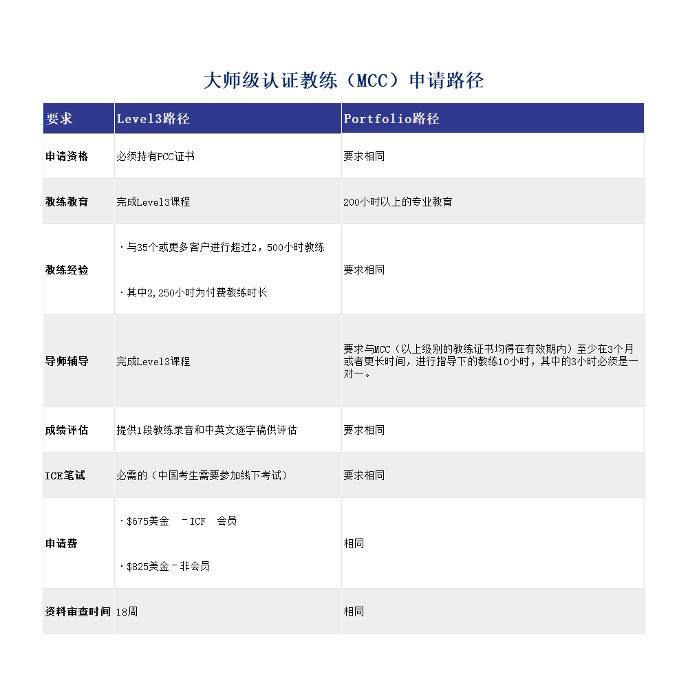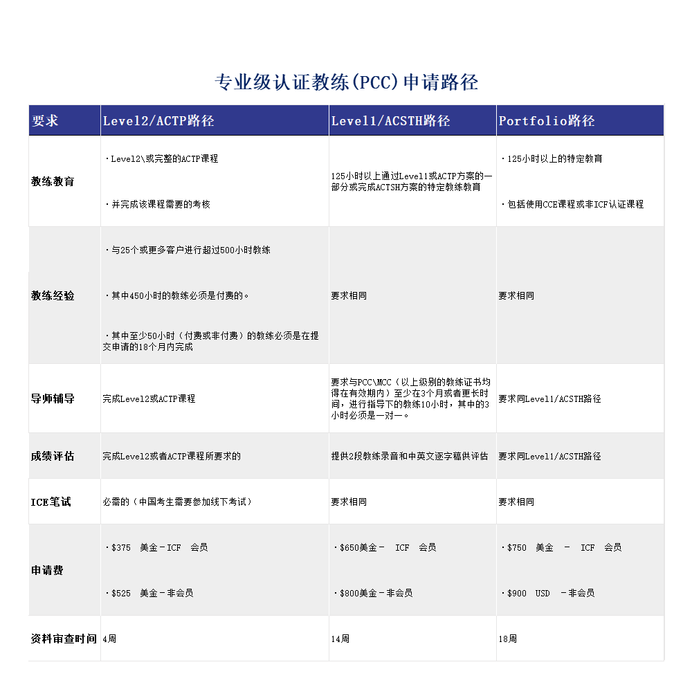 下面的表格比较了申请ACC、PCC和MCC证书的各种路径: