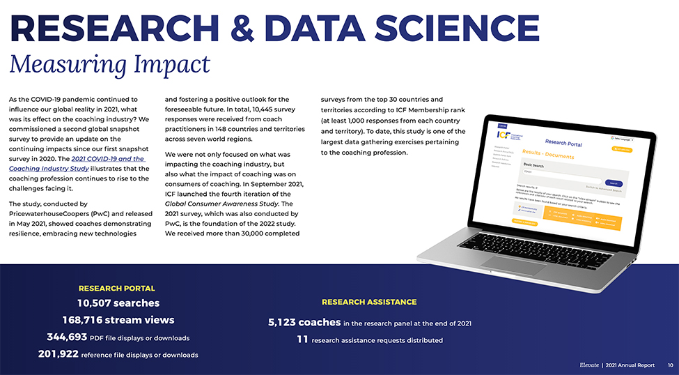 阅读更多关于ICF社区如何在2021年年度报告Elevate(https://coachingfederation.org/app/uploads/2022/07/ICF_2021_AnnualReport.pdf)中突破极限,促进积极变化,以及我们共同完成的所有工作。