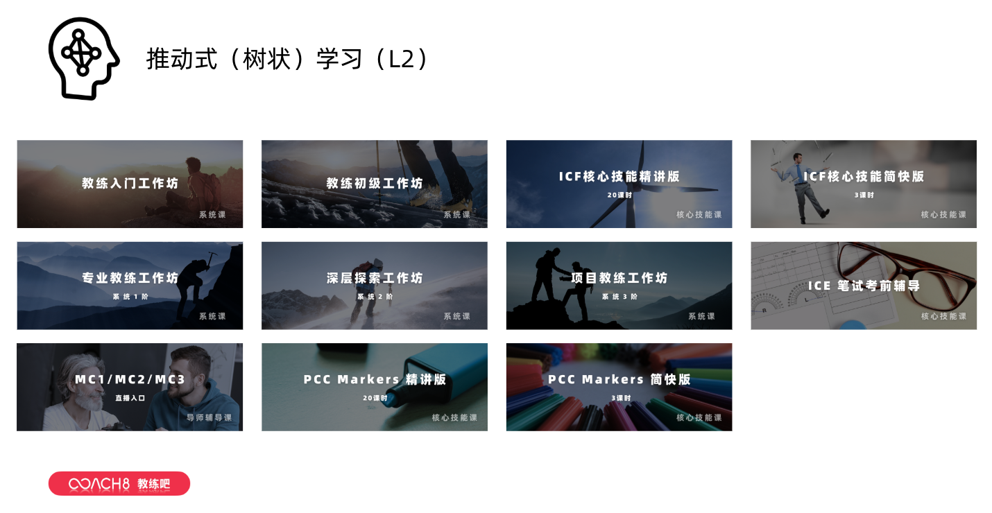 Coach8的课程培训部分是遵循着推动式学习(又称树状学习)和自主式学习(又称根状学习)两种教学理念设计出来的。