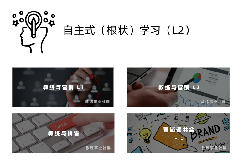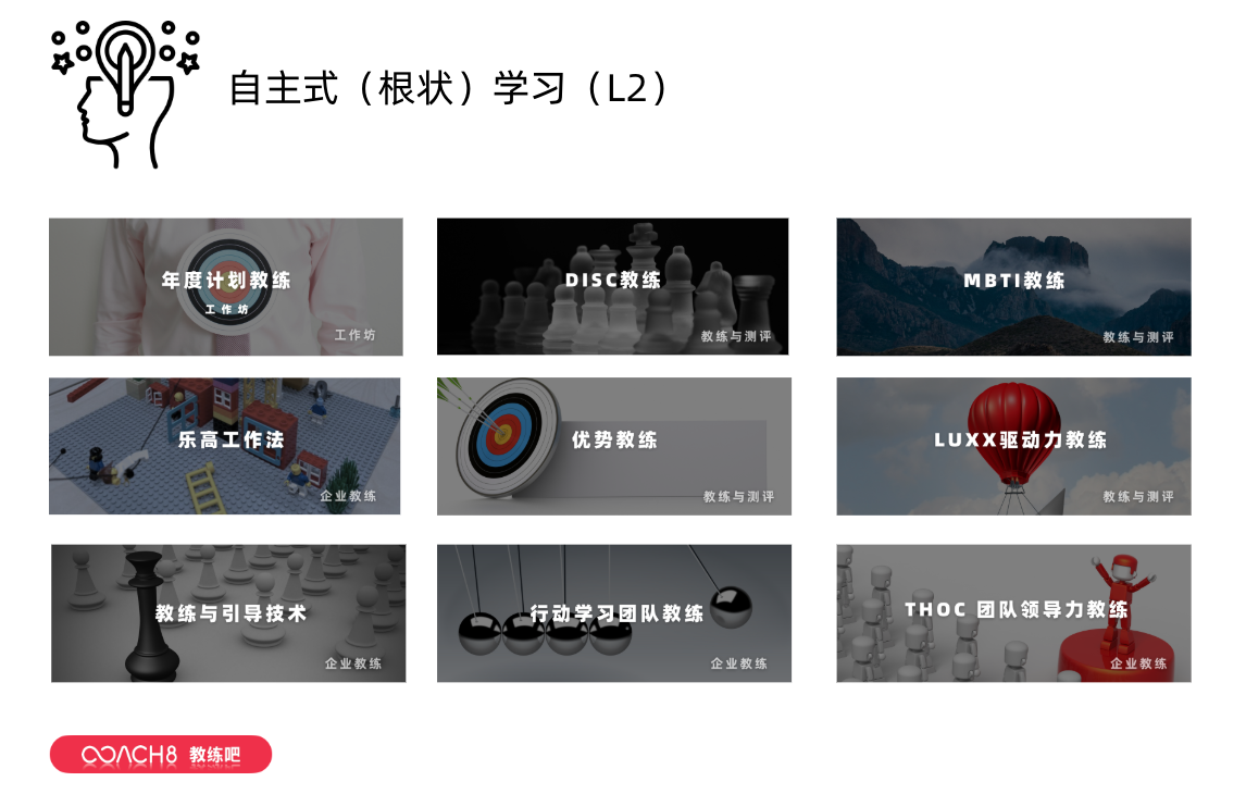 自主式学习:自主式学习在 Coach8是一个单独的教练学习项目我们称它为“Coach8 教练学习成长俱乐部“。自主式学习又被我们称为“根状学习法”。就如同它的名称一样,根状学习就像一棵大树的根系,它是真正能给人带来滋养的源泉。自助式学习(根状学习)关键是通过不同的知识点的摄入,让自己对于树状学习中的理论有更加深入的理解和认识。从教育学的角度来看,知识的纵横打通是最有利于人去理解和应用知识的。所以根状学习,即打破了时间、空间的限制,打破了班级、课程、老师的限制(就如同大学拆除了围墙一样的开放),设置众多的教练可能会涉及的知识外延或者技能方法,让学习者如同拥有了一座图书馆、丰富多样的选修课堂、具有跨领域的研讨会议室、让自己不断提高的实训营等。根状学习让学习打破了学科、专业、流派,也从另一个维度打破了单一的老师、单一知识方向的输入、单一的班级学员的各种限制,大家可以在自主式学习(根状学习)模块,认识更多志同道合的学习同侪、了解更多关于教练的方向和发展的可能、扩大大家的知识外延等等。其中,实训营、工作坊、研讨/练习课 、教练与测评、企业教练、教练事业社群都是针对根状学习法所设计出的学习模块。
