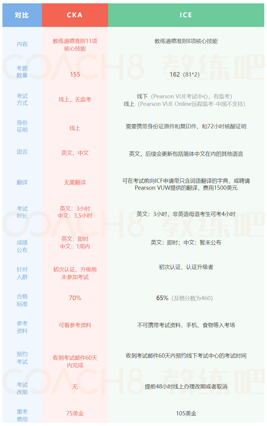 2022年8月1日,最新的ICF认证考试(ICF Credentialing Exam,简称ICE) 取代以往的CKA考试,2022年7月27日之后申请ICF教练认证的申请人,将采用新的考试方式。