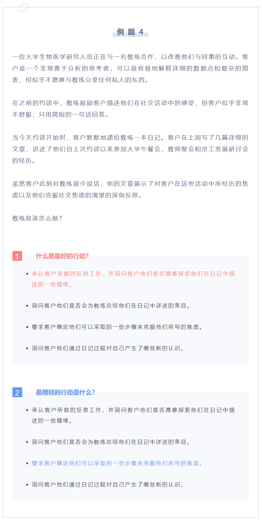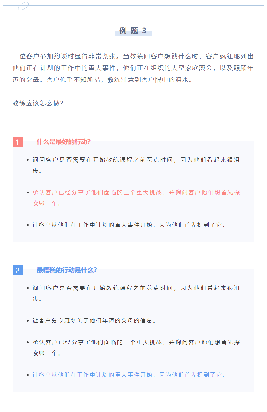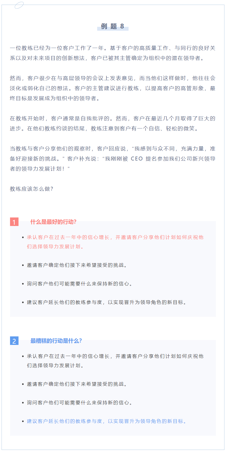 ICF提供了8道例题,我们将最佳行为和最差行为的正确答案标注出了颜色: