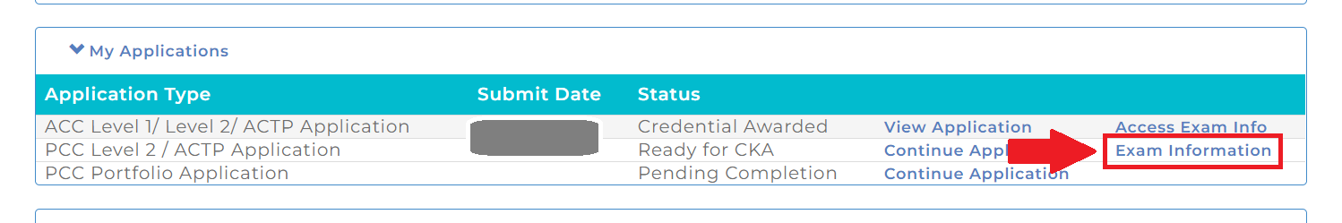 答:当申请人从coach8取得教练认证课程的毕业证,并积累到ACC或者PCC要求的教练时数,可以登录ICF官网提交认证的申请,一旦材料通过审核,ICF工作人员将通过电子邮件与申请人联系,并提供包含审核流程下一步的状态更新。申请人将进入认证申请页面,可以点击Exam information进入考试申请首页。