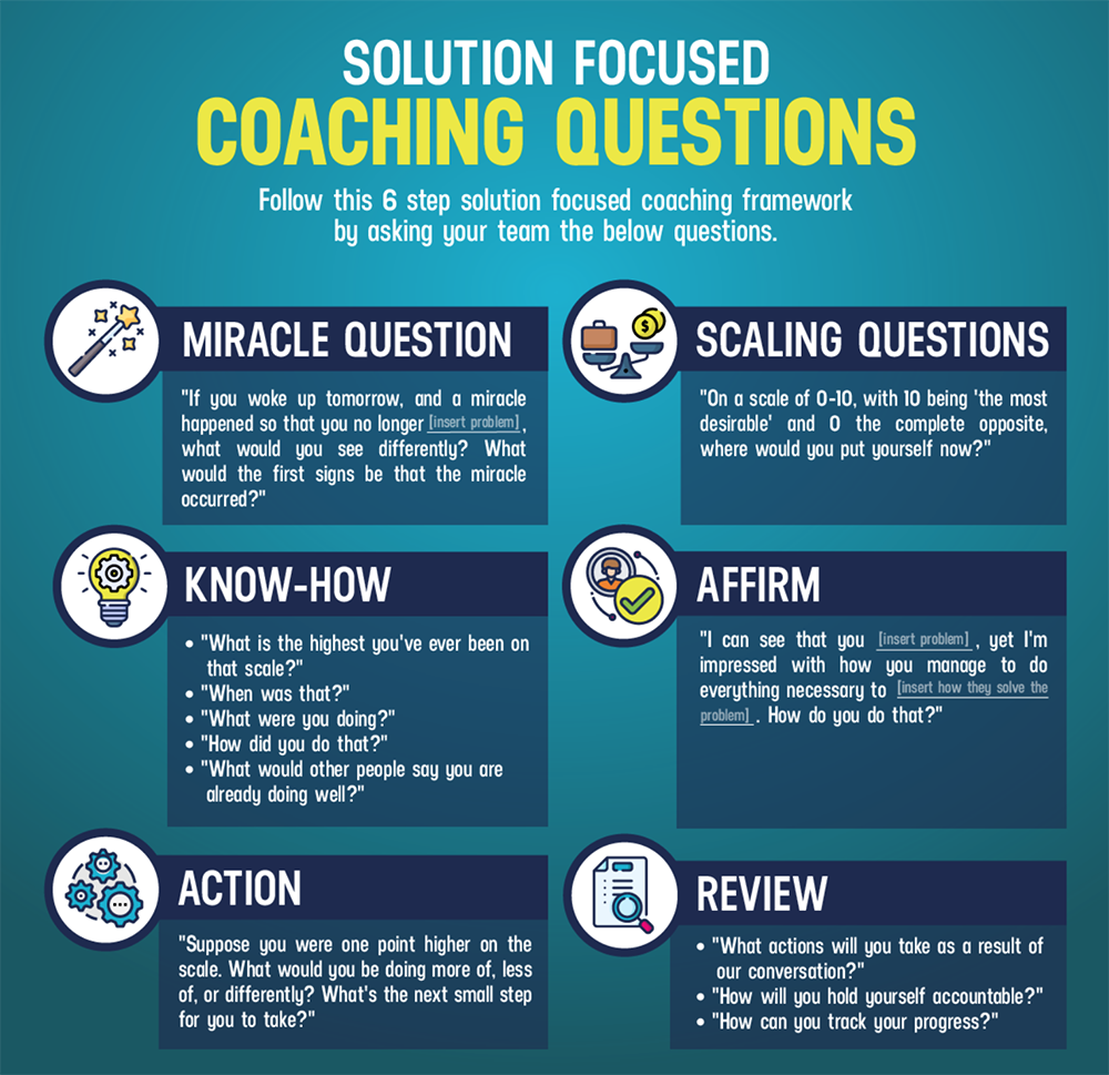 以解决方案为中心的销售辅导模式侧重于与销售代表一起探索解决方案,而不是讨论所遇到的问题的复杂性。总体想法是,这些技术有助于员工可视化最终目的地,以便他们可以为到达该点的旅程构建指南。