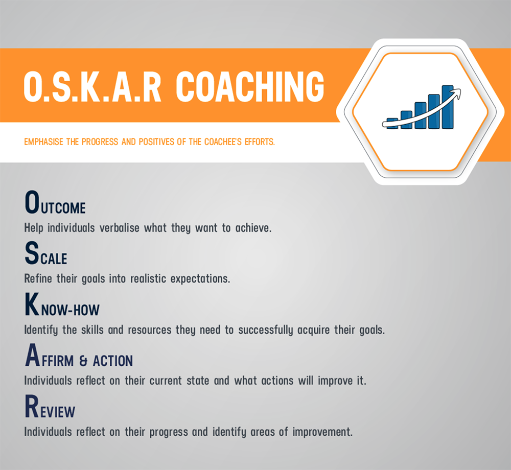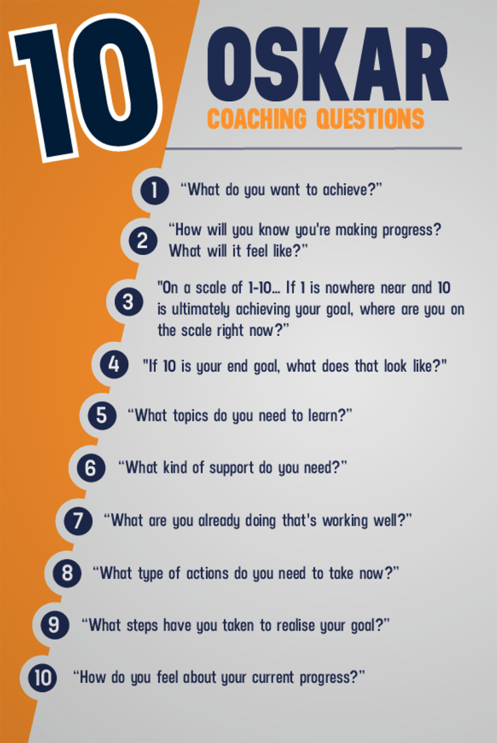 在OSKAR辅导模式的最后阶段,教练帮助销售人员反思他们的进展,同时确定需要改进的领域;因此,让他们对自己行动的进展负责。在这个阶段,教练在后续审查会议中为确定进展而应该问的问题类型可以包括: