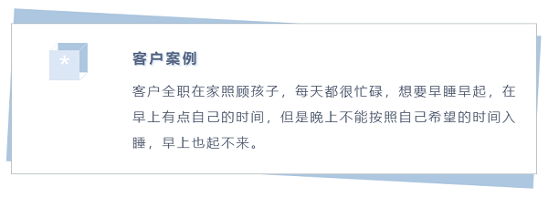 客户说:“每天事情都有很多,我还有自己想要做的事情,白天跟孩子在一起不能完成,所以只能到晚上他们入睡以后才能去做。晚睡,可以把当天自己想要做的事情都做完。”