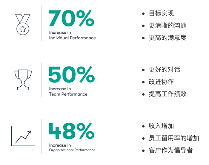 通过在工作中提供辅导,您能期待什么样的结果?国际教练联合会(ICF)报告了以下关于高管辅导的好处的统计数据: