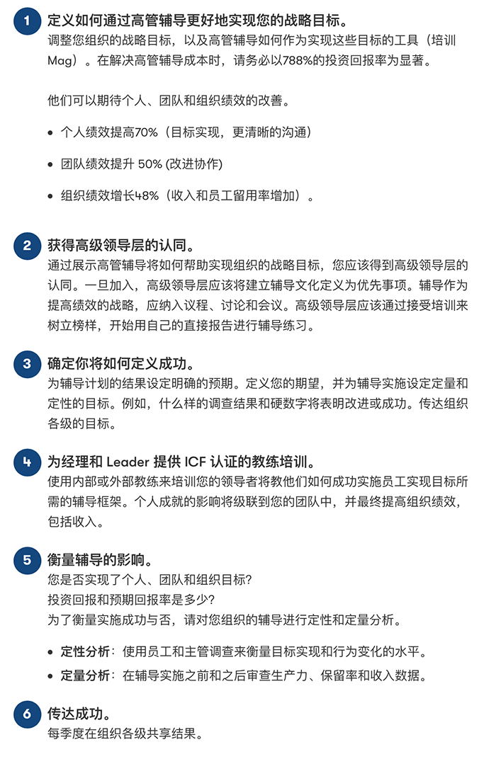 高管辅导是培养跨行业个人、团队和组织绩效的行之有效的方法。Metrix Global的一项研究发现,基于生产力提高和员工留用率等因素,高管辅导的投资回报率(ROI)为788%。