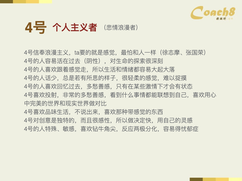 第四号人格非常推崇浪漫主义,对于浪漫的追求有着很高的要求。他们生活在感觉之中,因为他们是情绪化的,所以非常关注自己的感受。第四号人格最害怕的是与他人相似,他们必须展现出独特的个性,注重内在的感受。因此,我们常常看到许多明星属于第四号人格,他们中的许多人都患有抑郁症,甚至有自杀倾向。这是因为他们内在的感受太过强烈,所以容易陷入抑郁状态。像徐志摩、张国荣等人都属于第四号人格,他们天生具有才华,并且内在充满能量,因此容易走向灵性的道路。他们也容易从事文艺创作,具有很强的创作能力,因为他们内在的构造非常丰富。第四号人格倾向于活在过去,常常被认为是优柔寡断的。他们经常像林黛玉那样,无事可做就会哭上几下,感慨万分。因此,我们说第四号人格容易活在过去,他们的性格偏向阴郁。