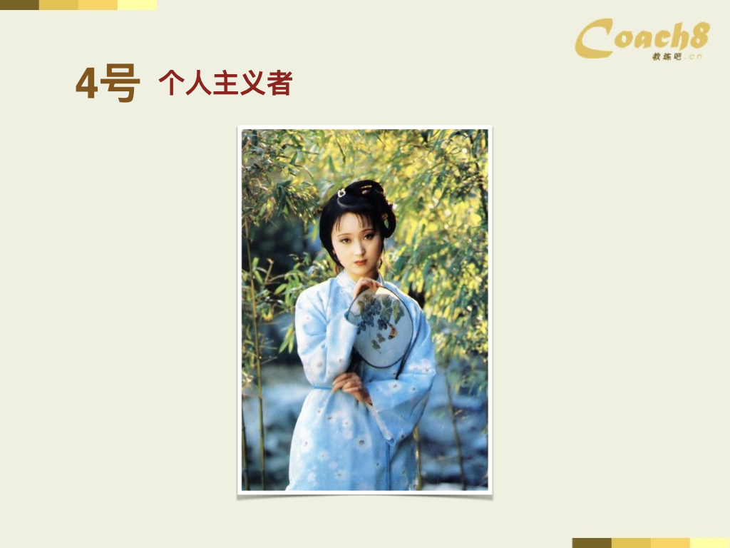 第四号人格代表人物是林黛玉,你可能会问为什么是她呢?我们来解释一下。第四号人格被称为个人主义者,他们相信个人内在的感受。因此,第四号人格最显著的特点就是悲情主义和浪漫主义。我更喜欢称他们为悲情浪漫主义者,因为我认为第四号人格的人非常悲情。