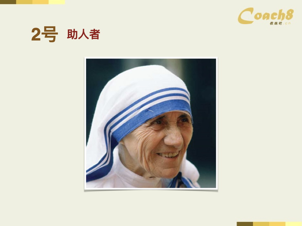 在九型人格理论中,助人者是其中一种人格类型,被标记为九型人格中的二号。助人者以其给予他人的特质而闻名,他们将注意力集中在他人身上,关注并帮助他人。这种人格类型的典型代表是特雷莎修女(Teresa),她是一位意大利出生的天主教修女,也是一位诺贝尔和平奖得主。特雷莎修女致力于在印度的贫困环境中提供帮助和关爱。