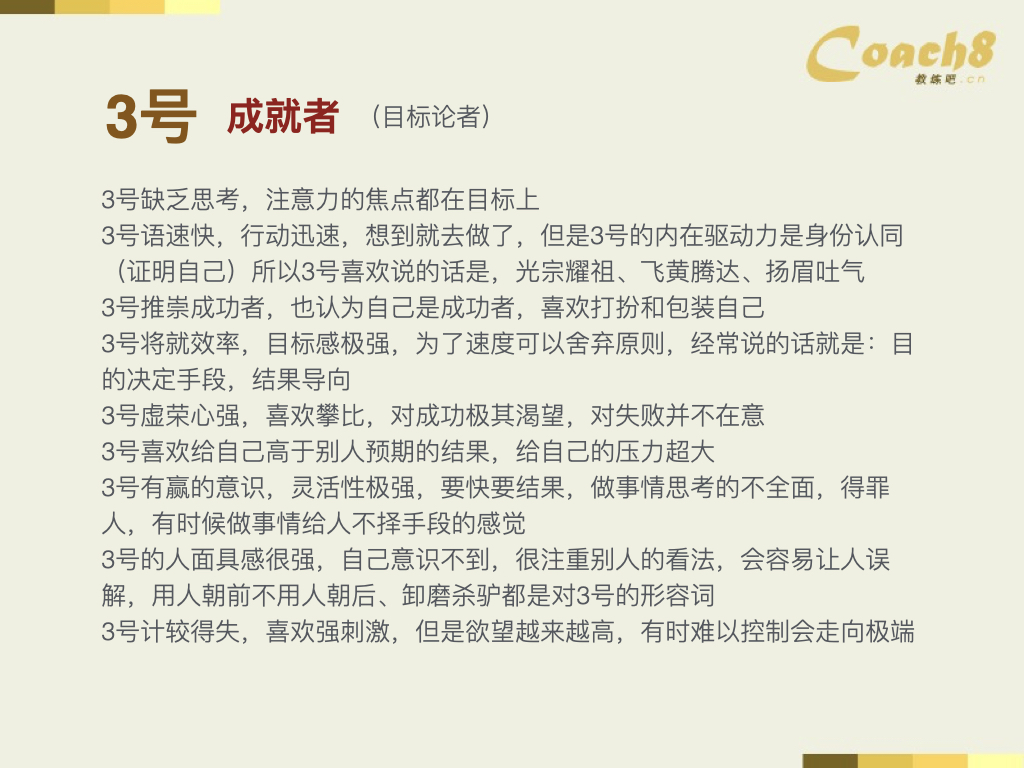 总结一下,成就者是九型人格理论中的目标型人,他们追求结果,注重成功和荣耀感。他们是行动派,迅速采取行动,受到赞扬和认可的激励。