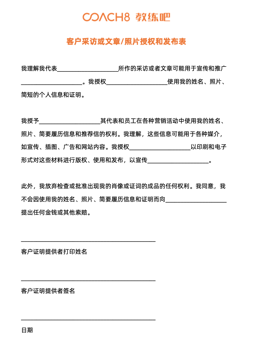 客户采访或文章/照片授权和发布表模板(WORD文件)