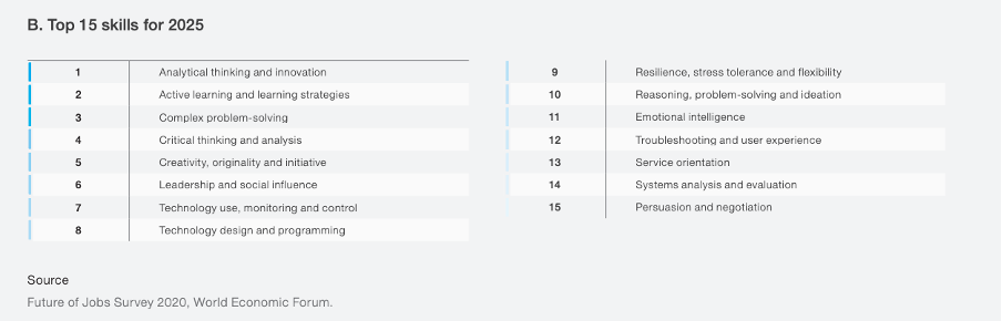 最重要的是分析思维和创新,其次是主动学习和学习策略;解决复杂问题;批判性思维和分析;创造力、独创性和主动性;以及领导力和社会影响力(见下表)。