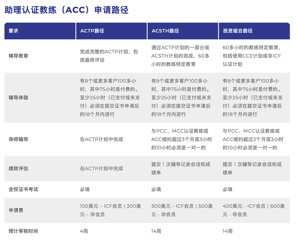对于 ACC 证书,导师教练必须是当前 ICF 证书持有者,在 PCC 或 MCC 级别上具有良好的信誉,或者在 ACC 级别上具有良好的信誉并且至少更新过一次证书。