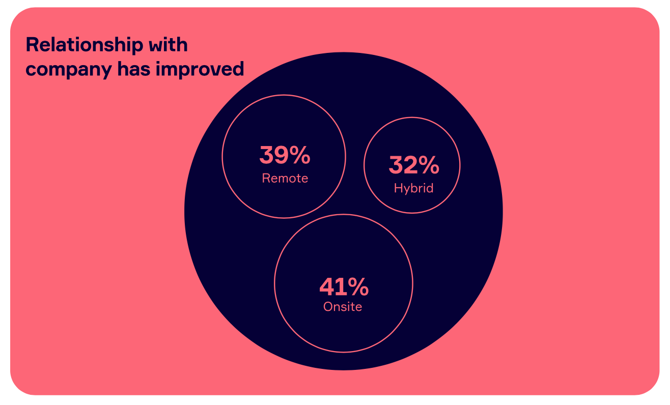 69%的混合型员工在理想的工作环境中工作,相比之下,46%的员工在远程工作,20%的员工在现场工作。