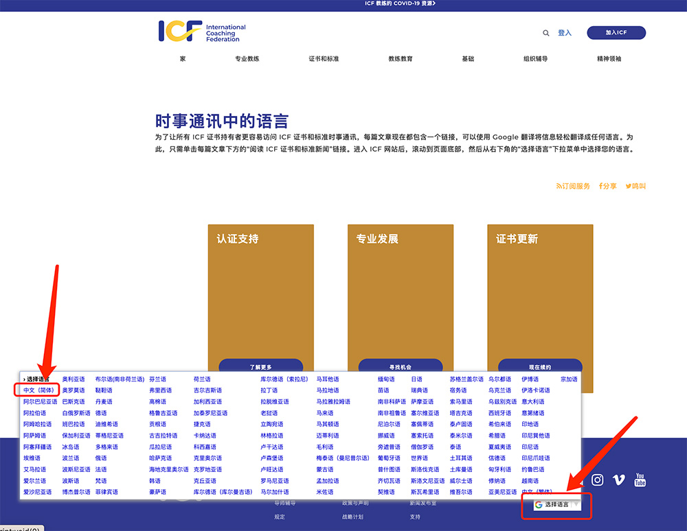 来自于ICF官网消息:为了让所有 ICF 证书持有者更容易访问 ICF 证书和标准时新闻资讯实事,ICF网站每篇文章现在都包含一个链接,可以使用 Google 翻译将信息轻松翻译成任何语言。为此,只需单击每篇文章下方的“阅读 ICF 证书和标准新闻”链接。进入 ICF 网站后,滚动到页面底部,然后从右下角的“选择语言”下拉菜单中选择您的语言。
