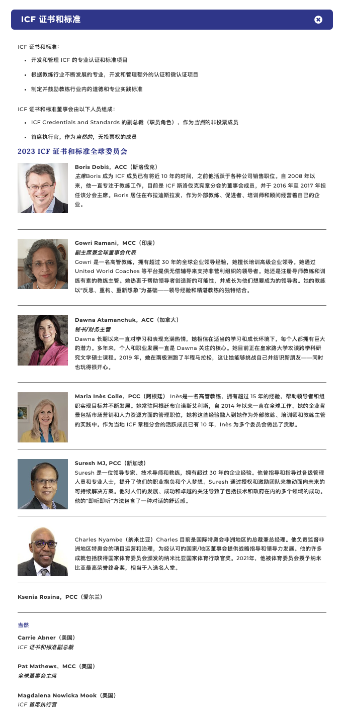 董事会支持 ICF Credentials and Standards 提升专业标准的使命,以便 ICF 证书持有者可以通过教练赋能世界。