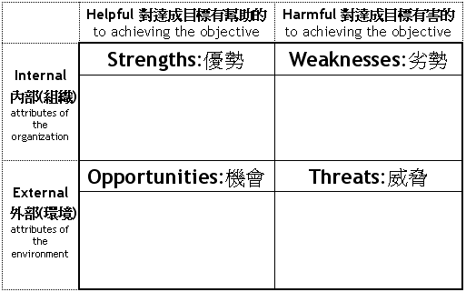 SWOT分析在最理想的状态下,是由专属的团队来达成的,一个SWOT分析团队,最好由一个会计相关人员,一位销售人员,一位经理级主管,一位工程师和一位专案管理师的组成。